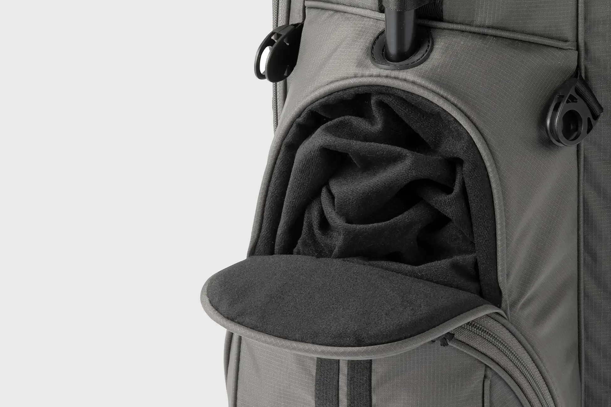 スコープやボールを素早く取り出せるマグネット式ポケットや、ゴルフボールをダース箱ごと収納できるポケット、フードの収納に役立つ大型サイドポケットといった、充実の収納力を備えます。