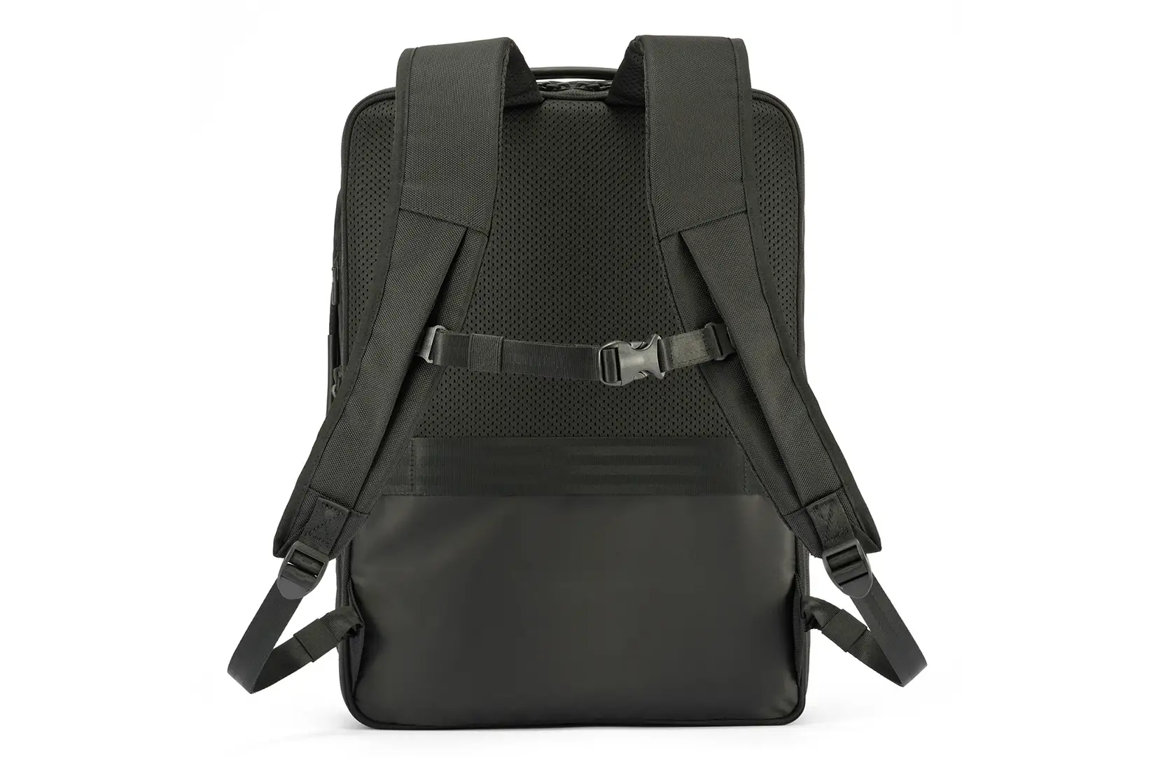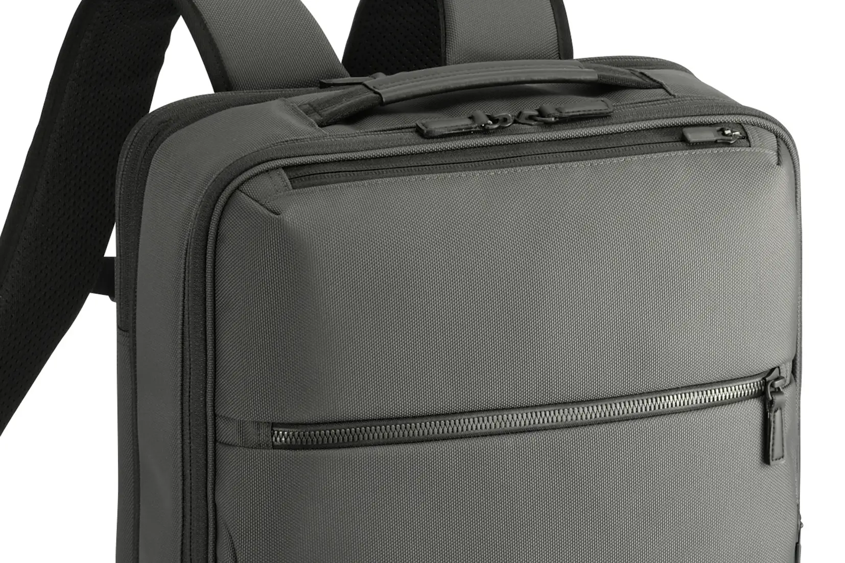 周囲だけでなく着用者にも邪魔になりにくい薄マチ形状ながら、書類やノートPCなどの荷物が効率良く入る無駄のないスクエア型で、容量をしっかり確保しています。