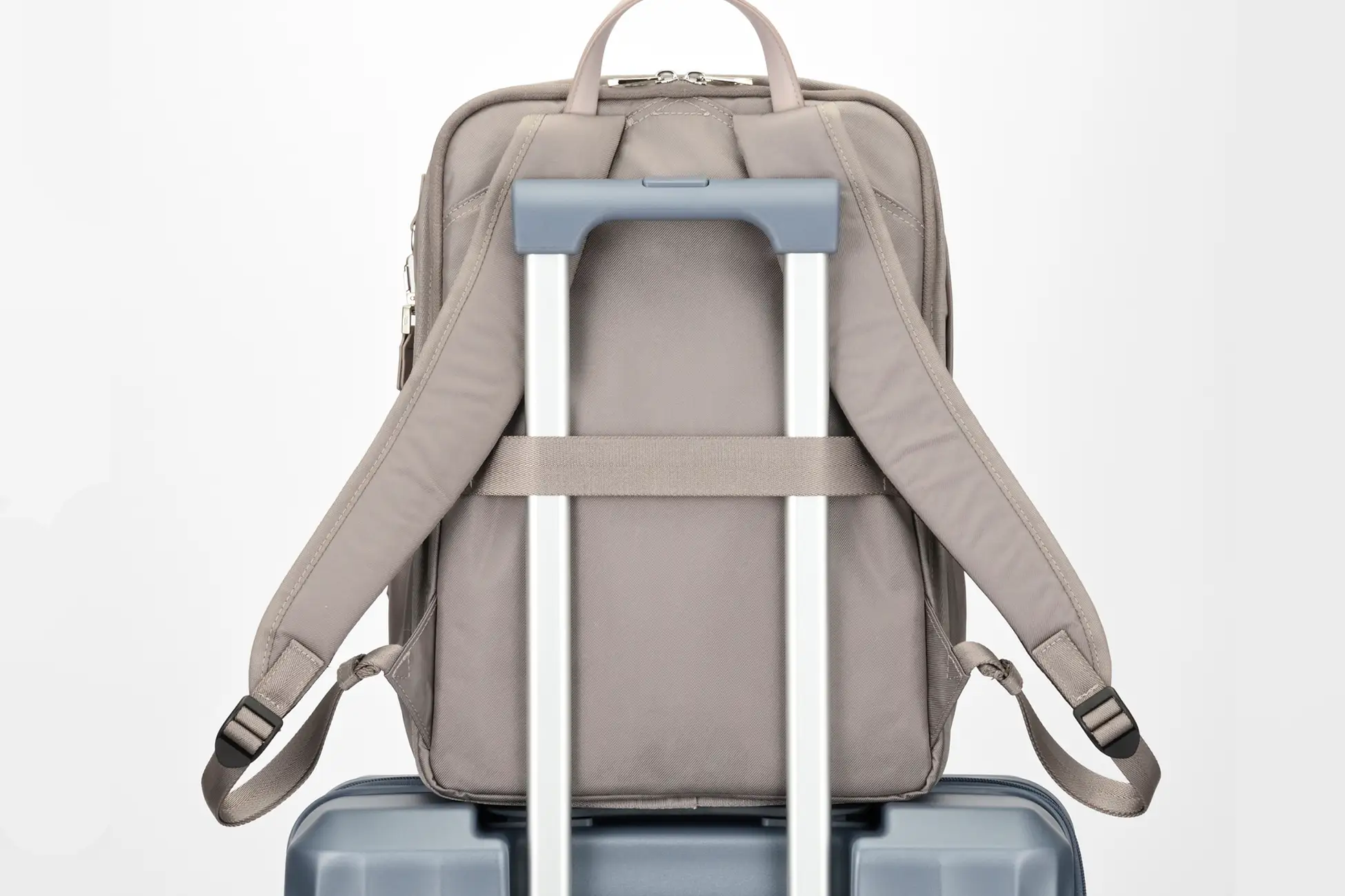 背面にスーツケースのプルドライブハンドルに固定できるセットアップベルトを配置。