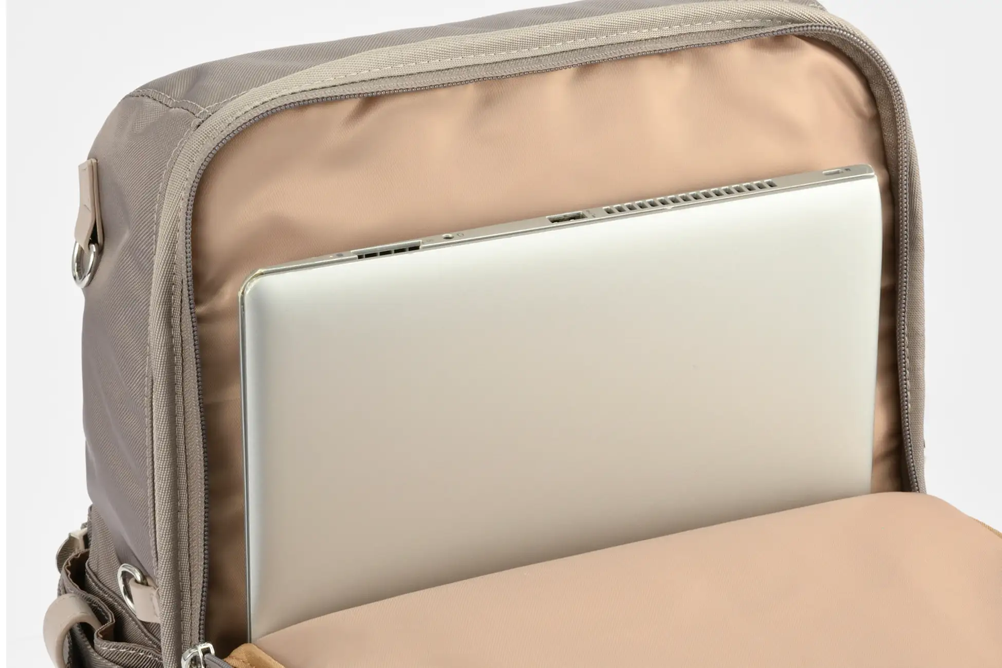 一部モデル※は、リュック背面側にメイン収納部とは別に独立したPC収納部を配置。雨除けフラップ付きで雨の日も安心です。