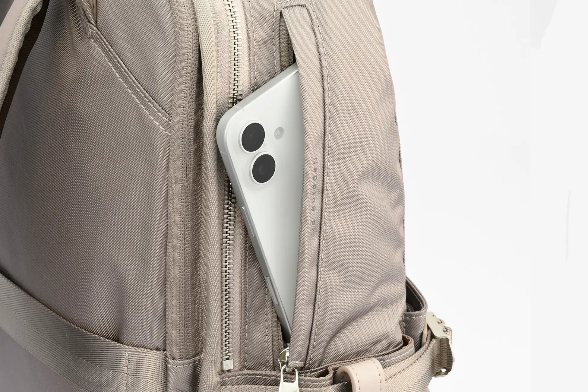 スマートフォンが収まる背面ポケット