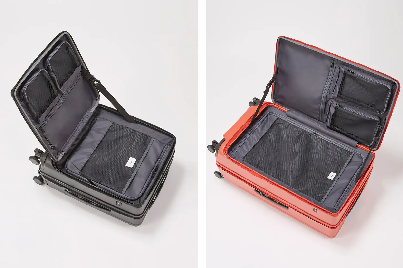 機内持込サイズは立てたまま出し入れできる「縦開き」仕様、預け入れサイズは省スペースで開閉できる「横開き」仕様で、狭い空間でも快適に使えます。