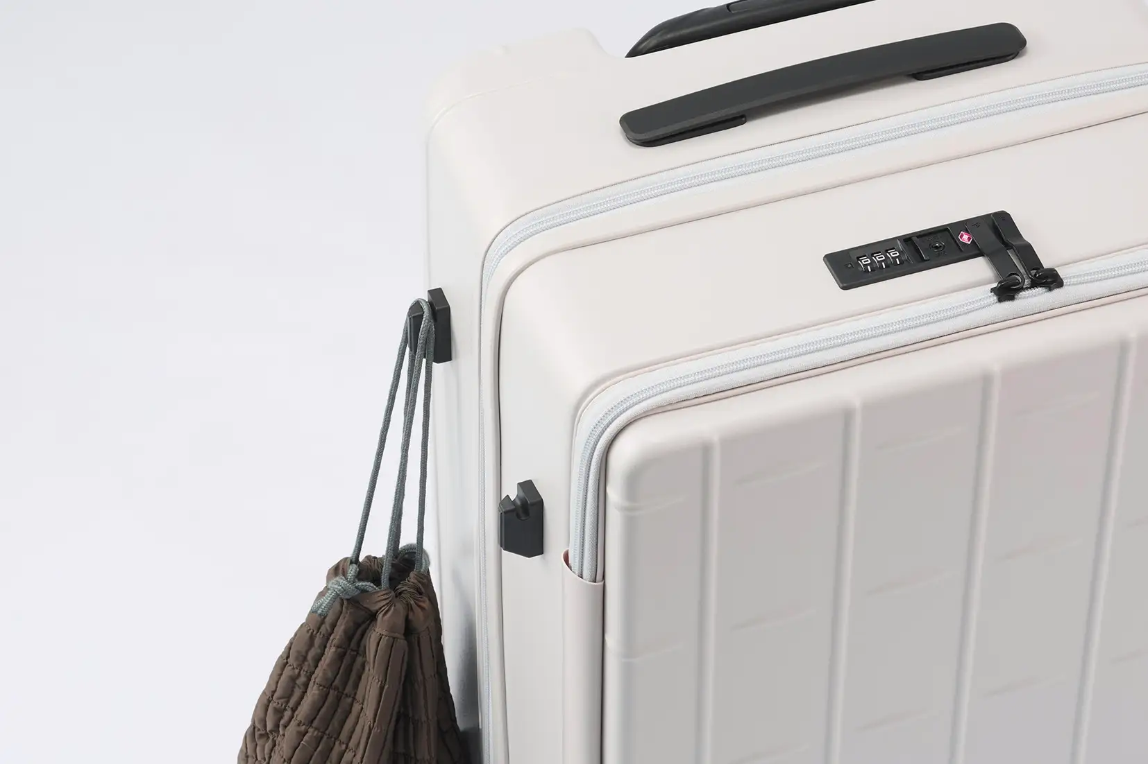 預け入れサイズのスーツケース側面に、土産袋などを掛けられるサイドフックを装備。