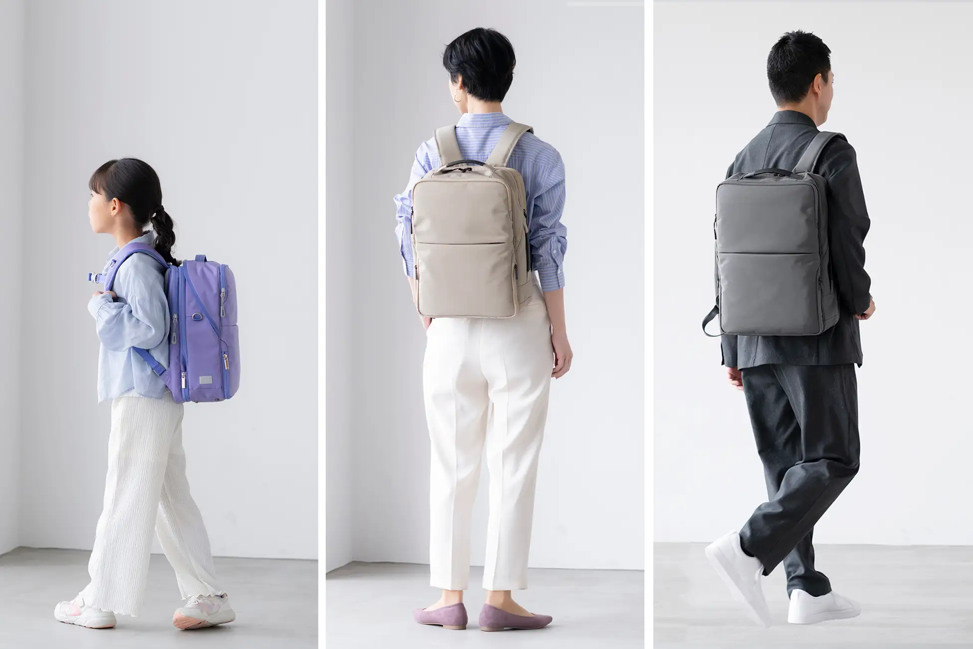 中・大サイズは中高生〜大人までの使用を想定し、通学から通勤まで対応できるベーシックカラーの3色を展開します。