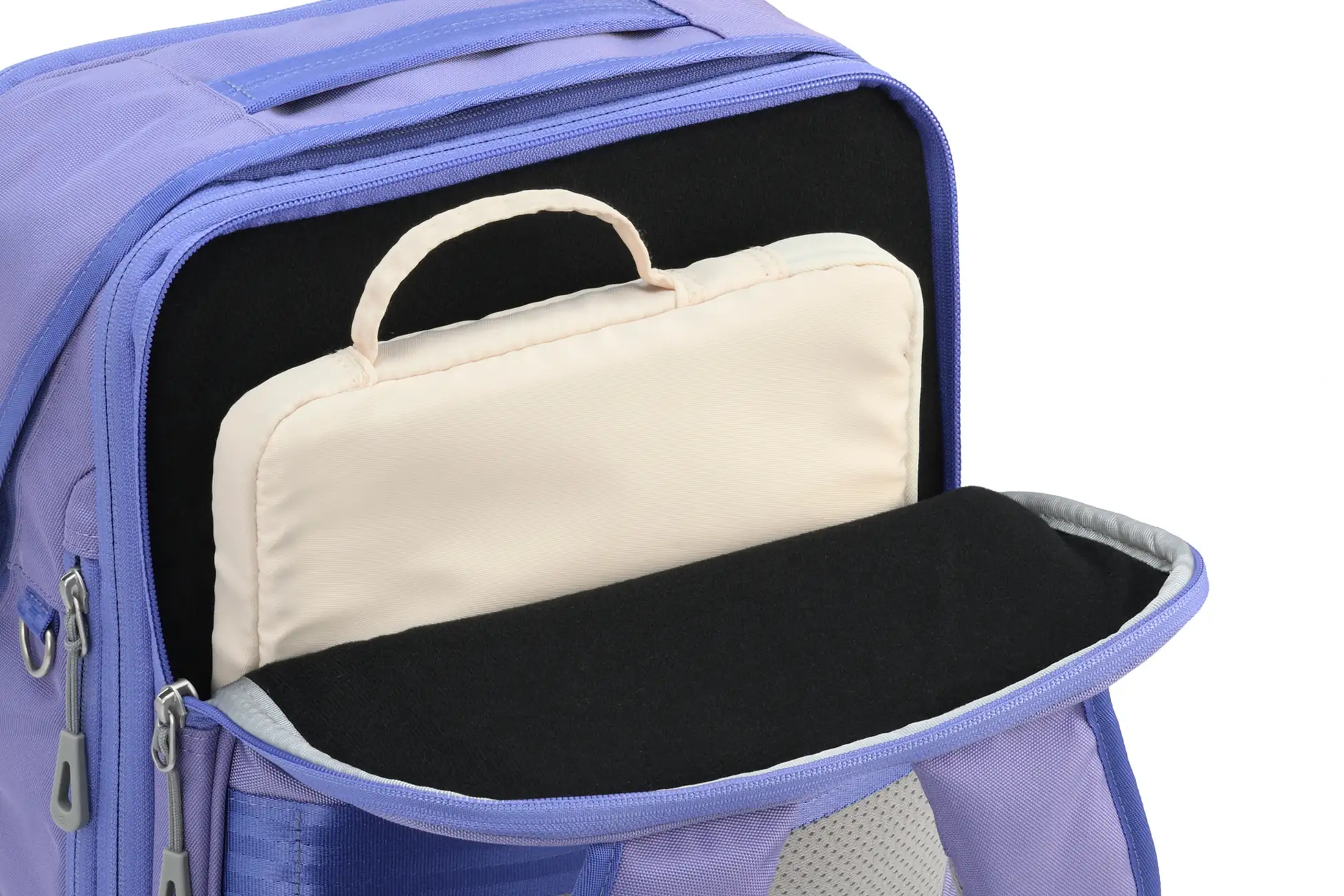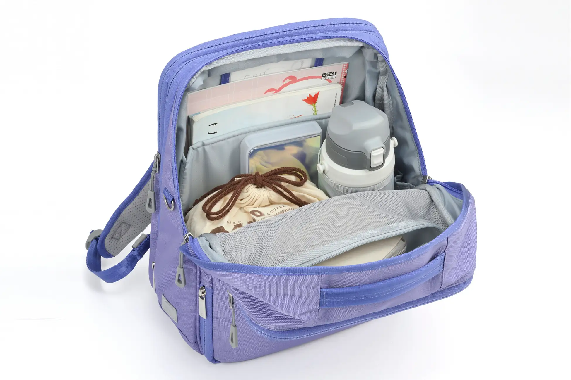 教材とお弁当などを分けられる間仕切りポケットや、小物収納に便利な整理整頓ポケット、移動中も出し入れしやすい外ポケットなどを配置。タブレット端末は独立スペースに収納できます。