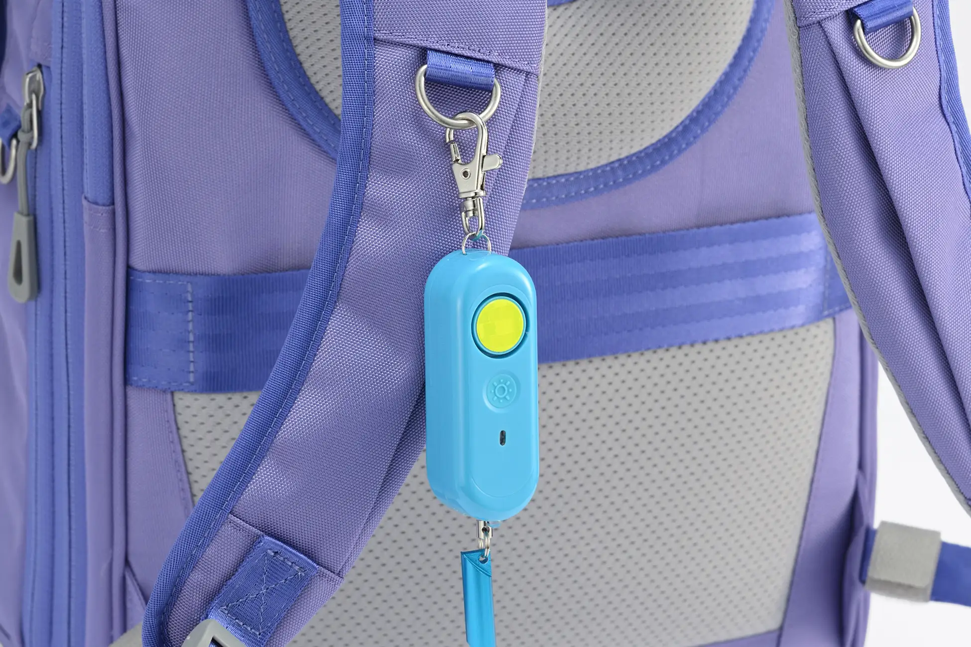 通学時の安全性を高めるため、防犯ブザーを装着できるぶら下げリング、夜道で視認性を高める反射ワッペン、鍵やGPS端末を取り付けられるキーストラップを搭載しました。