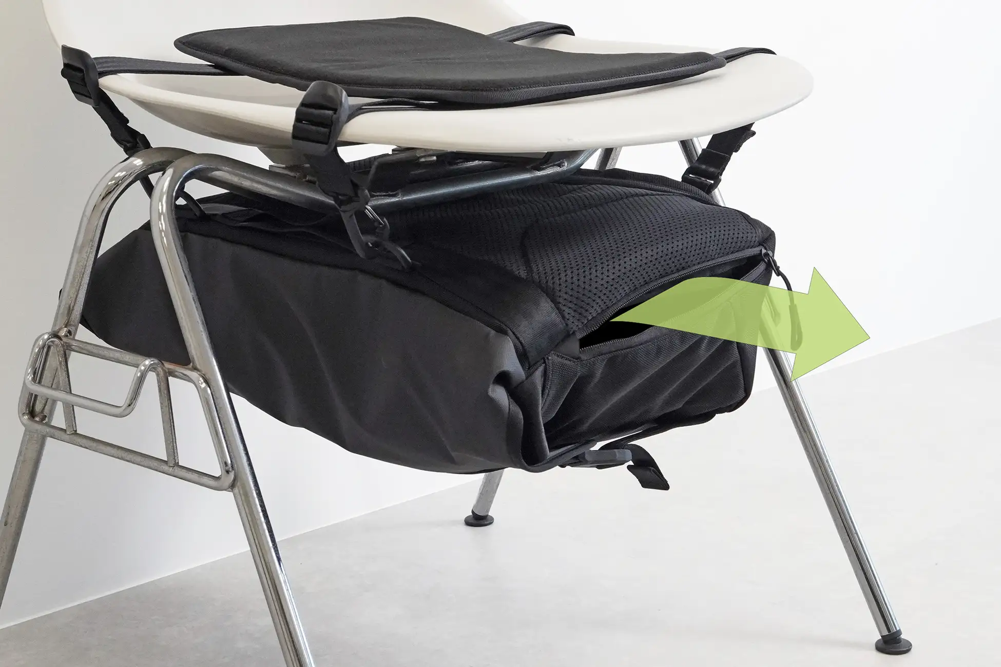また、バッグハンギングシステムに取り付けられるクッションマットを付属。座布団代わりとして使えるほか、通常時はPCスリーブのクッション材としても活用できます。マットはメッシュ面と起毛面を備え、リバーシブル仕様で季節に合わせた温度調整が可能です。
