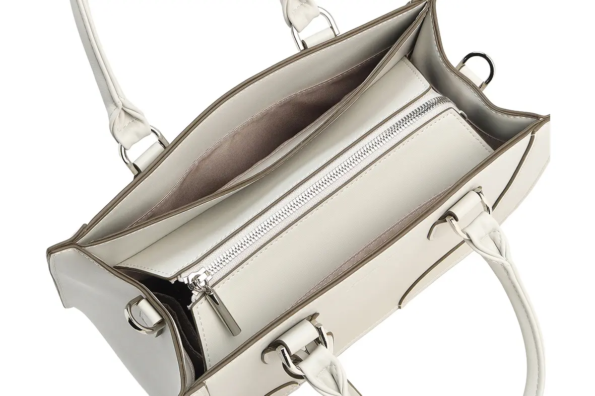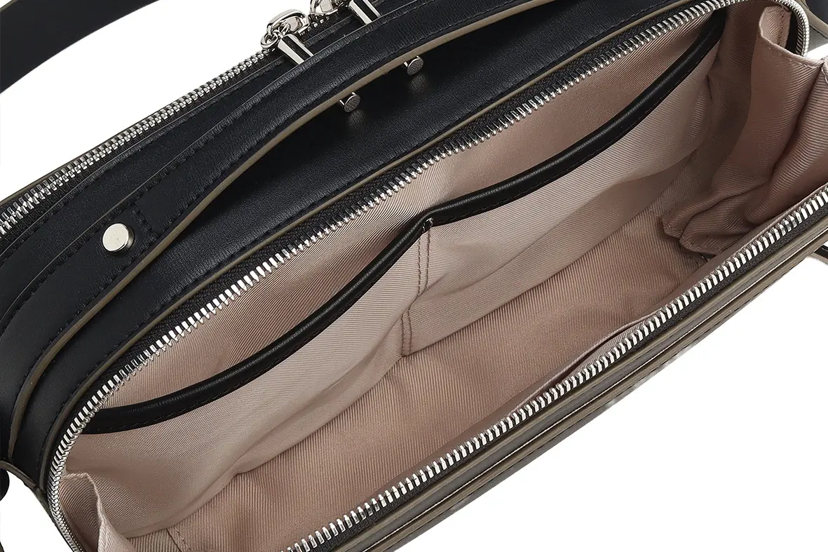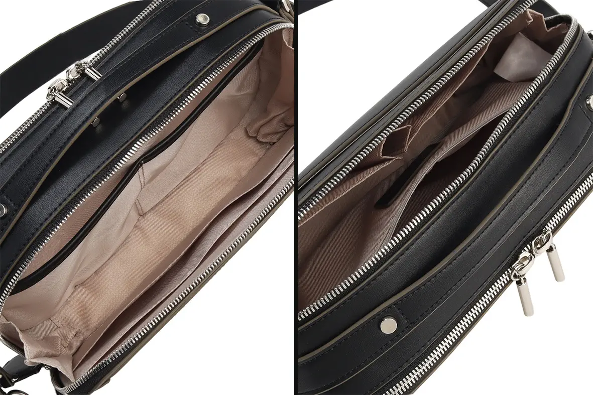④メイン収納は2 スペース仕様で、荷物を仕分けやすく、整理整頓を快適にします。内装にはDカンを備え、チャームやキーホルダーを取り付けられます。