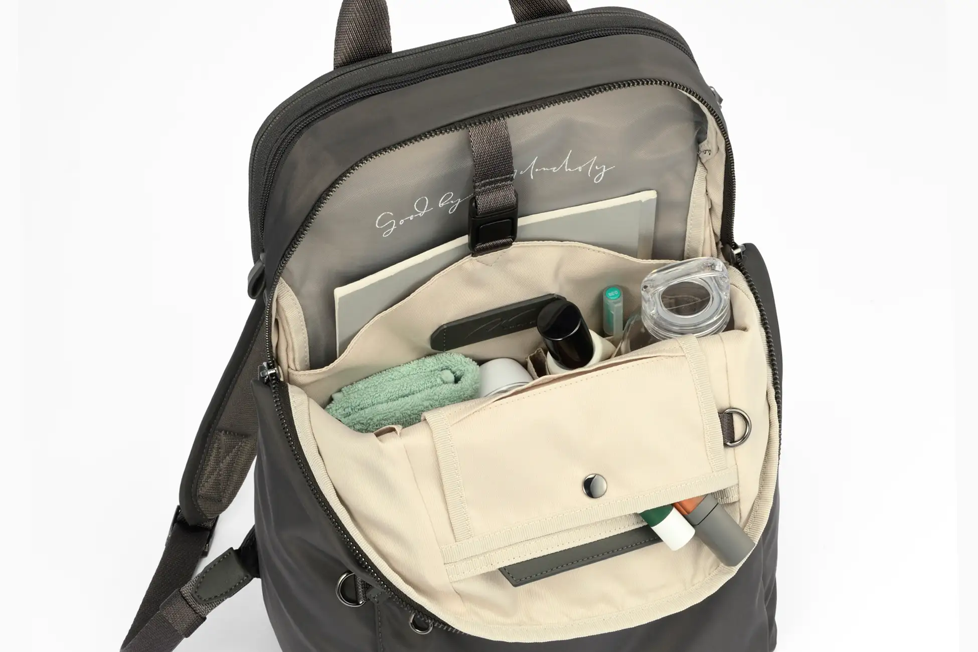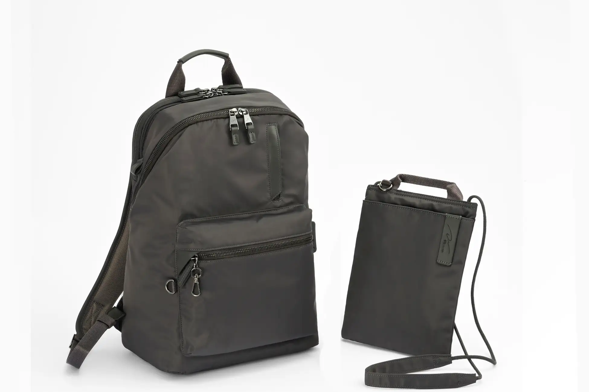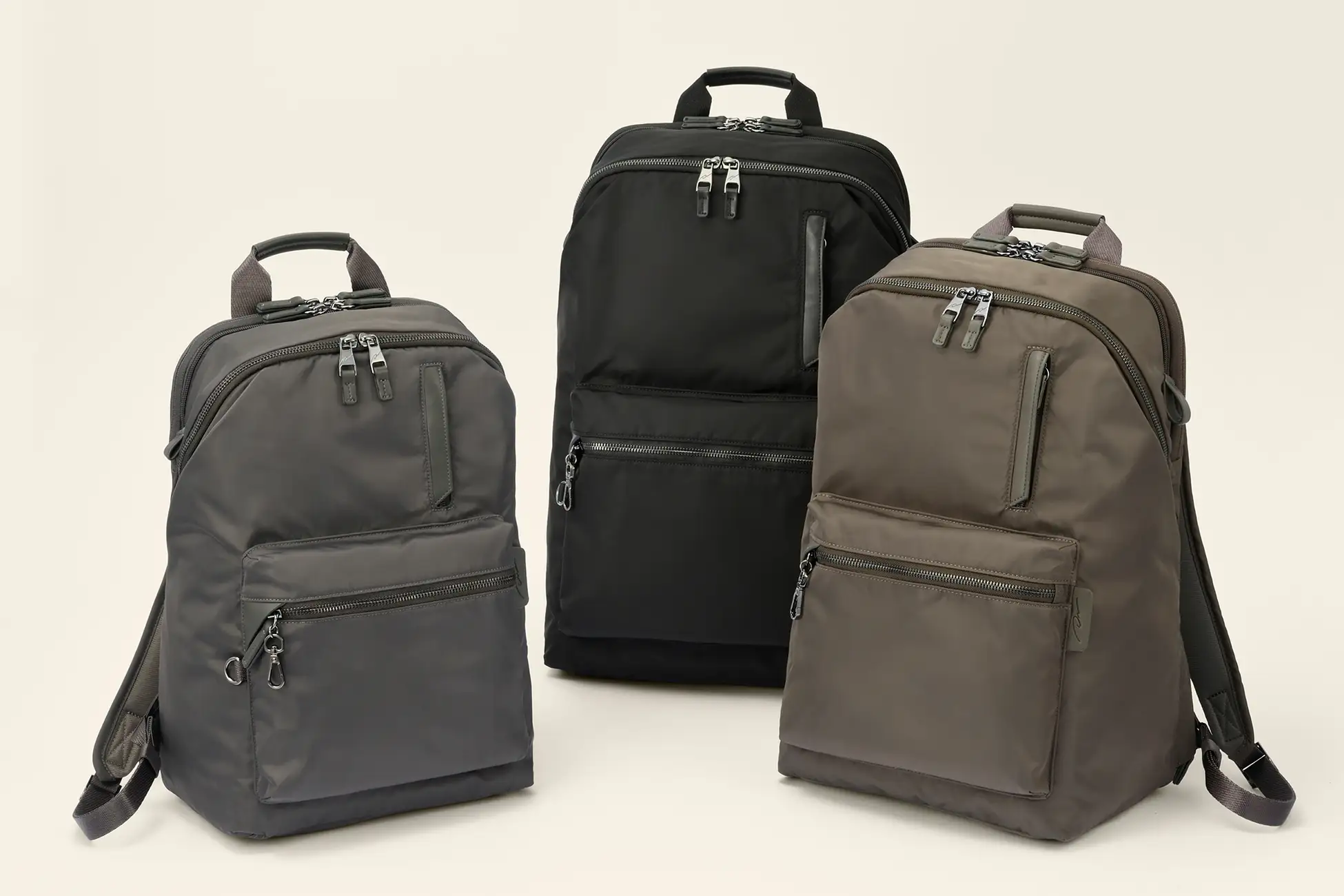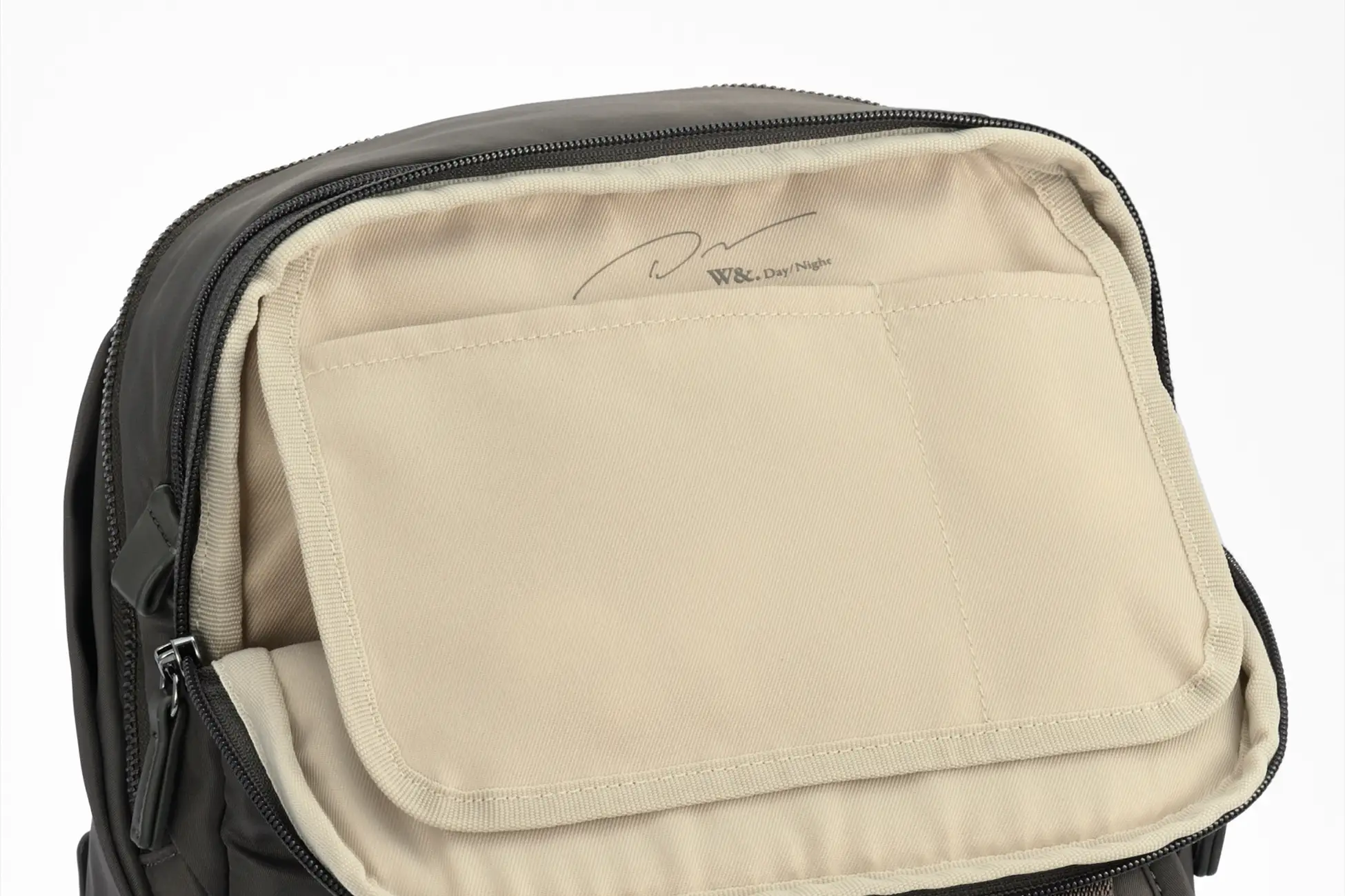 弱撥水加工を施したナイロンツイル素材を採用。PC 収納部は雨除けフラップ付きで、フラップ内のポケットにUSB メモリやモバイルWi-Fi などを収納可能です。