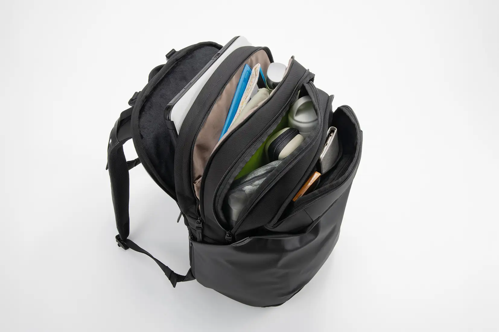 本製品は、リュック内部のスペースを徹底的に活用し、衣類・ビジネスツール・小物雑貨・ノートPC・水筒といった、用途の異なる荷物を仕分けて整理できる「5収納構造」を採用。仕事からアフターまで、リュック一つで対応できます。