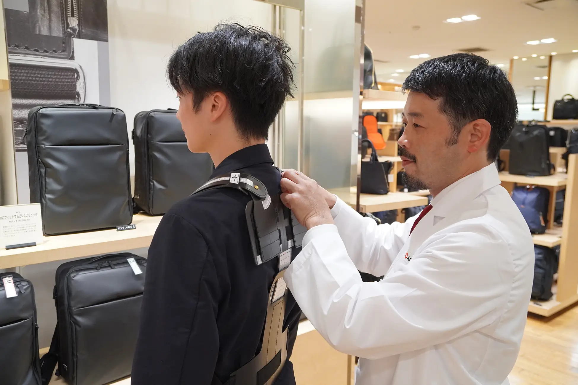 体験型イベント「ハーネスフィットラボ」では、店頭スタッフによる「ガジェタブルDP2 4U」のフィッティング提案や、「4Uハーネス」開発者の博士(工学)若生 然太 がお客様の背中を計測・提案するサービスを日数限定で行います。