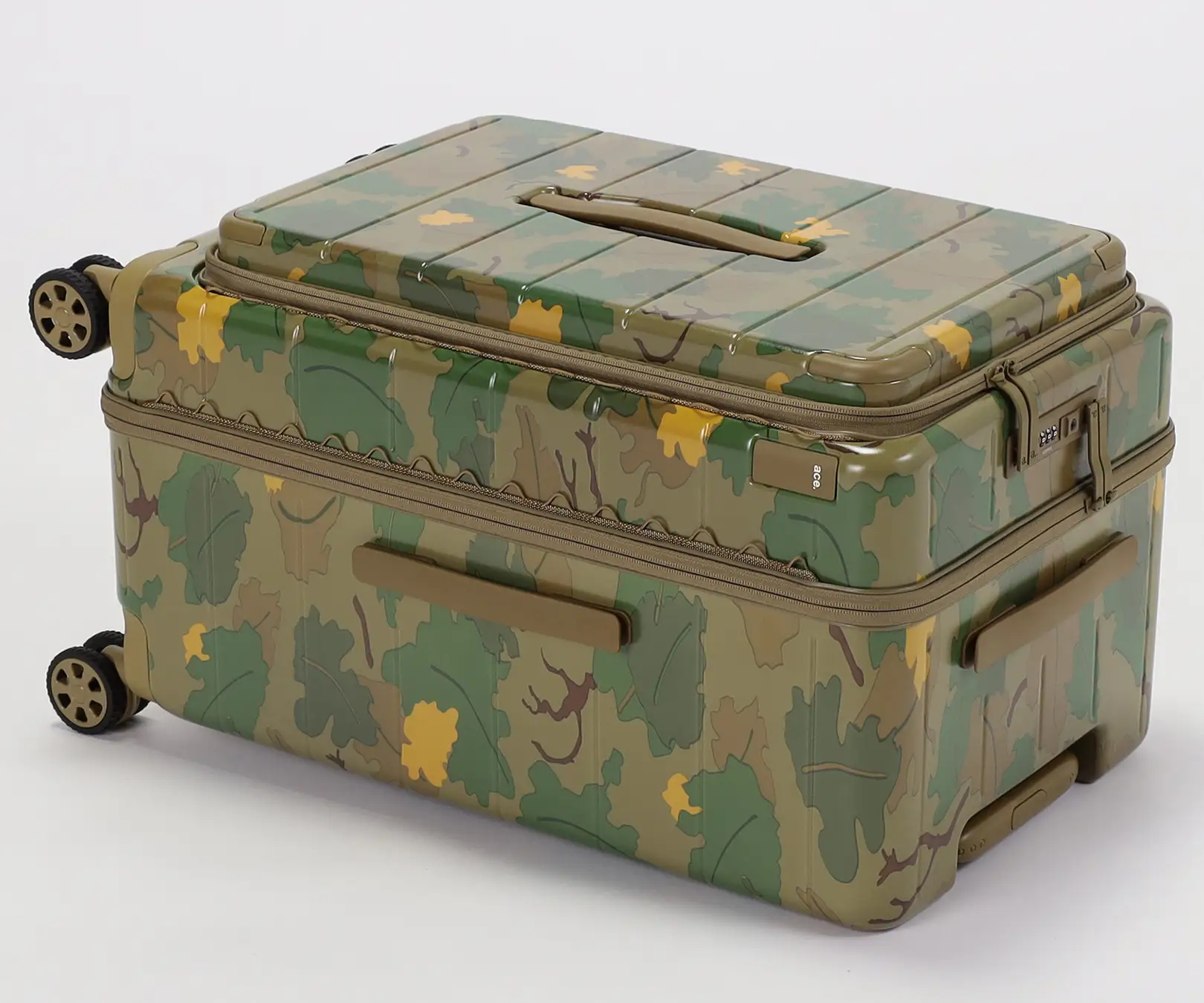 ・葉や雲をモチーフにした迷彩柄を採用。自然に溶け込み、空港で見つけやすいデザインです。