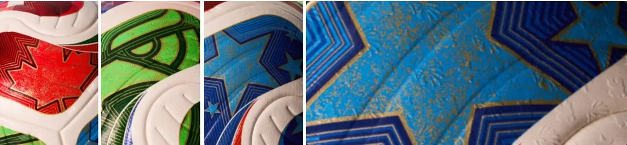 開催国である3ヵ国のアイコン、カエデの葉(カナダ)、鷲(メキシコ)、星(アメリカ)がエンボス加工されており、4枚のパネルには意図的に深いディボス加工が施されています。これらの加工によりボールの飛行安定性を高めています。また、エンボス加工は雨天時のボールのグリップ力を高め、パフォーマンス上の利点をもたらしています。