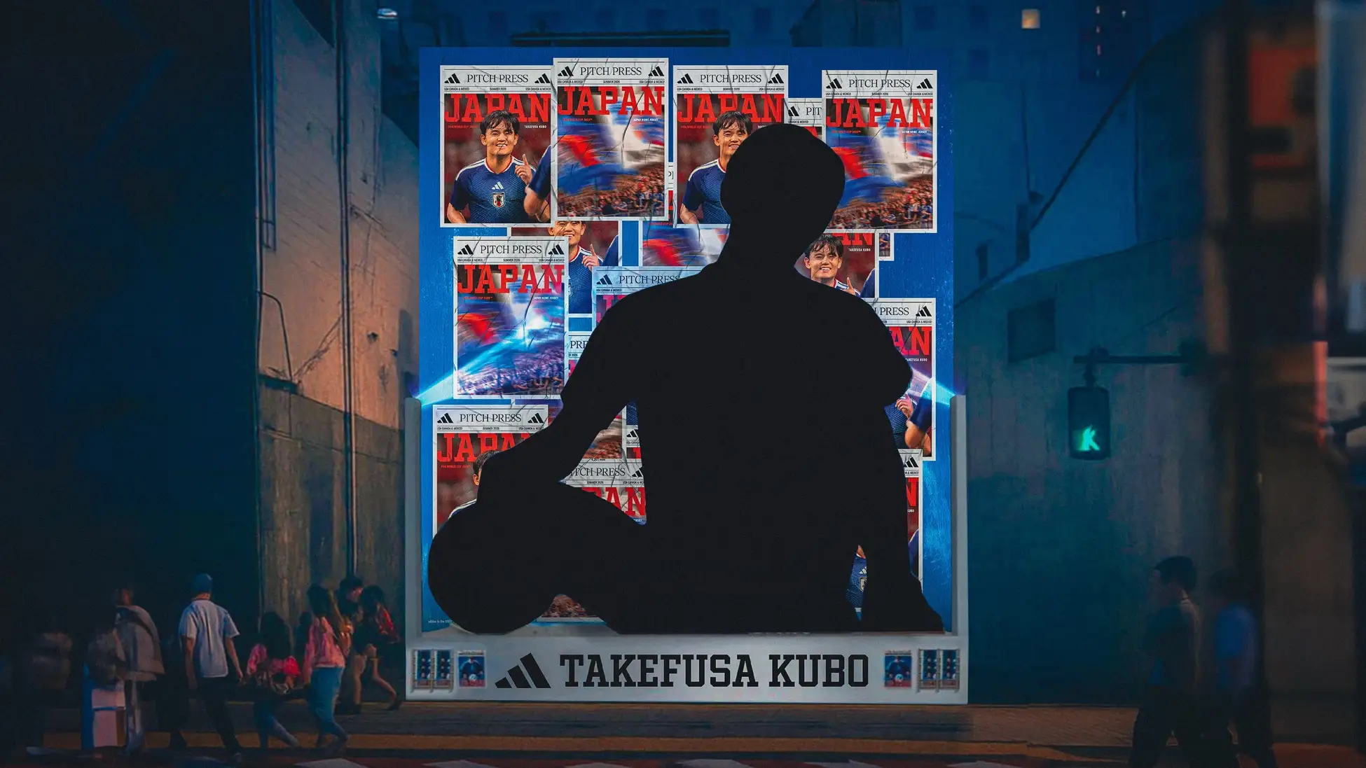 11月より、全国3都市で新ユニフォームを纏ったサッカー日本代表選手たちが登場する屋外広告を順次展開します。東京では、世界で最も人が集まる交差点のひとつである渋谷スクランブル交差点に、久保 建英選手を中心とした選手たちが登場。新ユニフォームの世界観を体感できる15秒間のイマーシブ映像が、渋谷の街を包み込みます(11月7日(金)〜11月20日(木))。