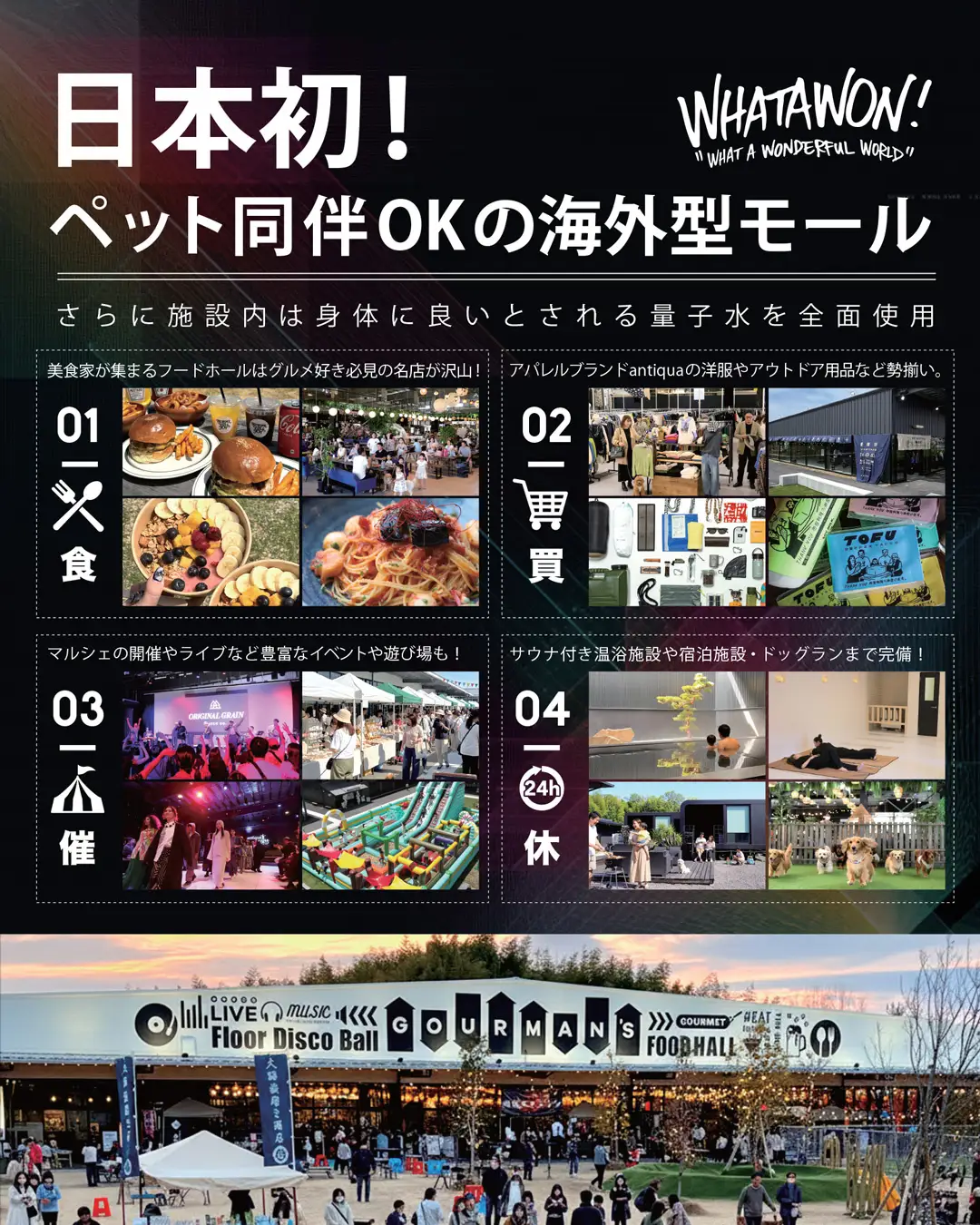 WHATAWONは、音楽・グルメ・ショッピング・リラックスが一体となった滞在型エンターテイメントモールです。