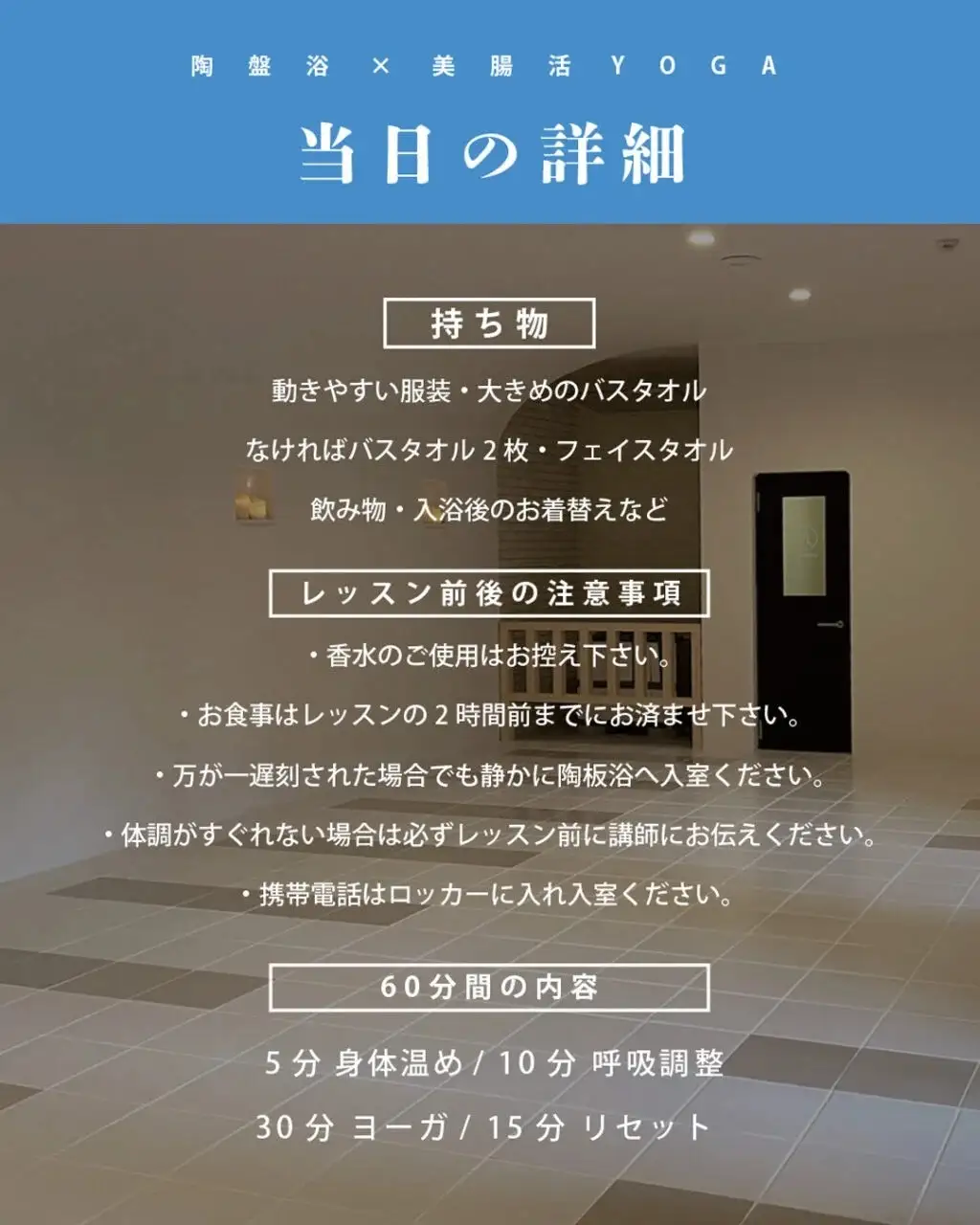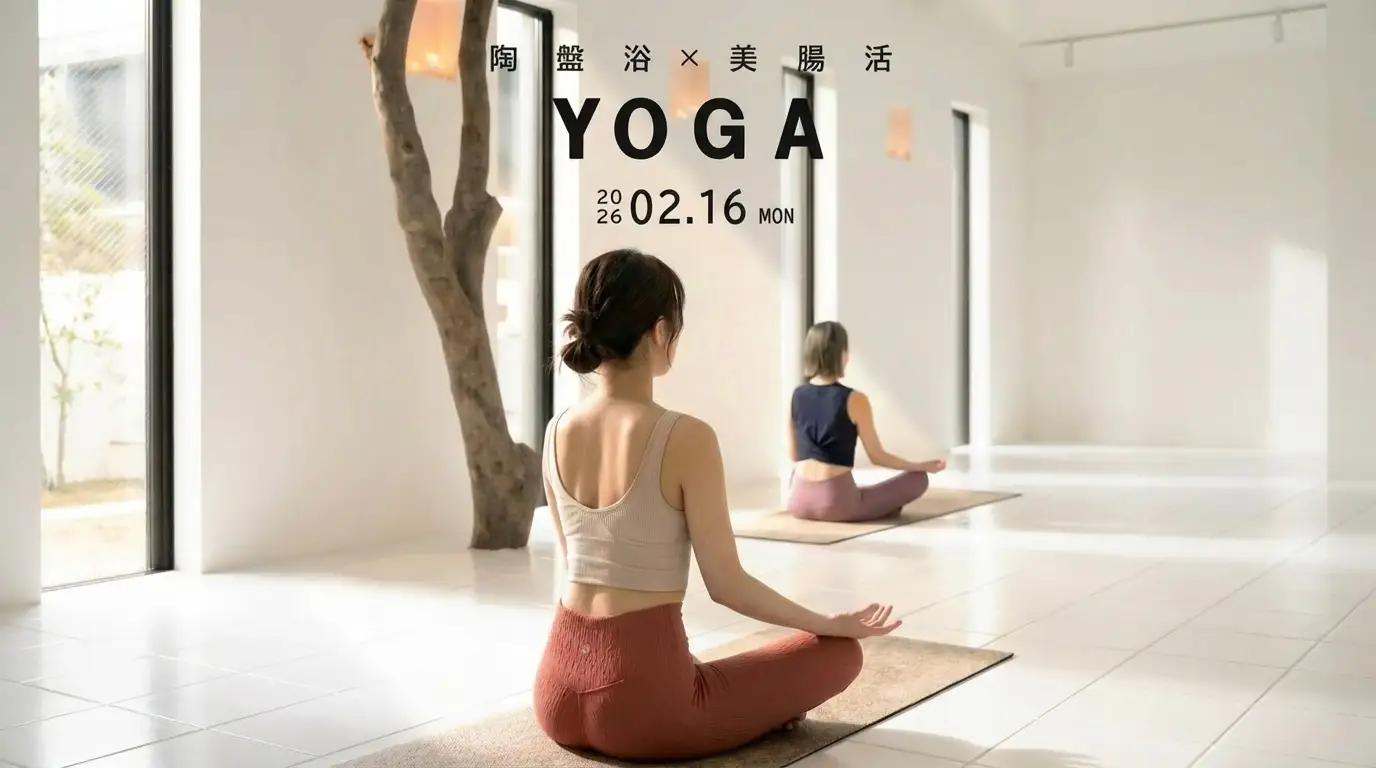 遠赤外線を放つ陶盤浴の空間で身体を芯から温めながら行う本レッスンは、ただのヨガでも、ただの温浴でもありません。