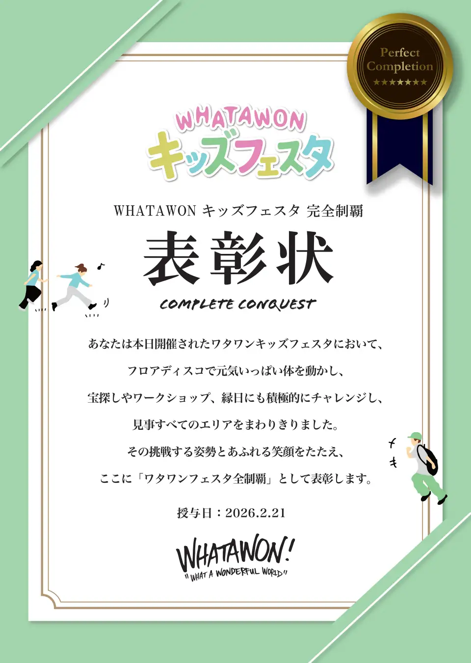 全エリア達成で「キッズフェスタ表彰状」を進呈します。