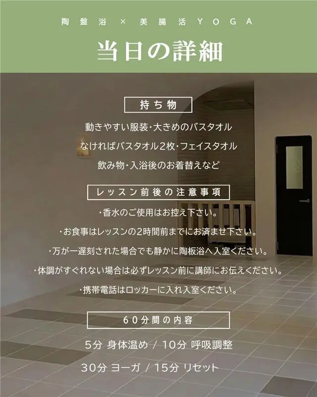 陶板浴と美腸活ヨガを組み合わせた特別プログラムを開催します。