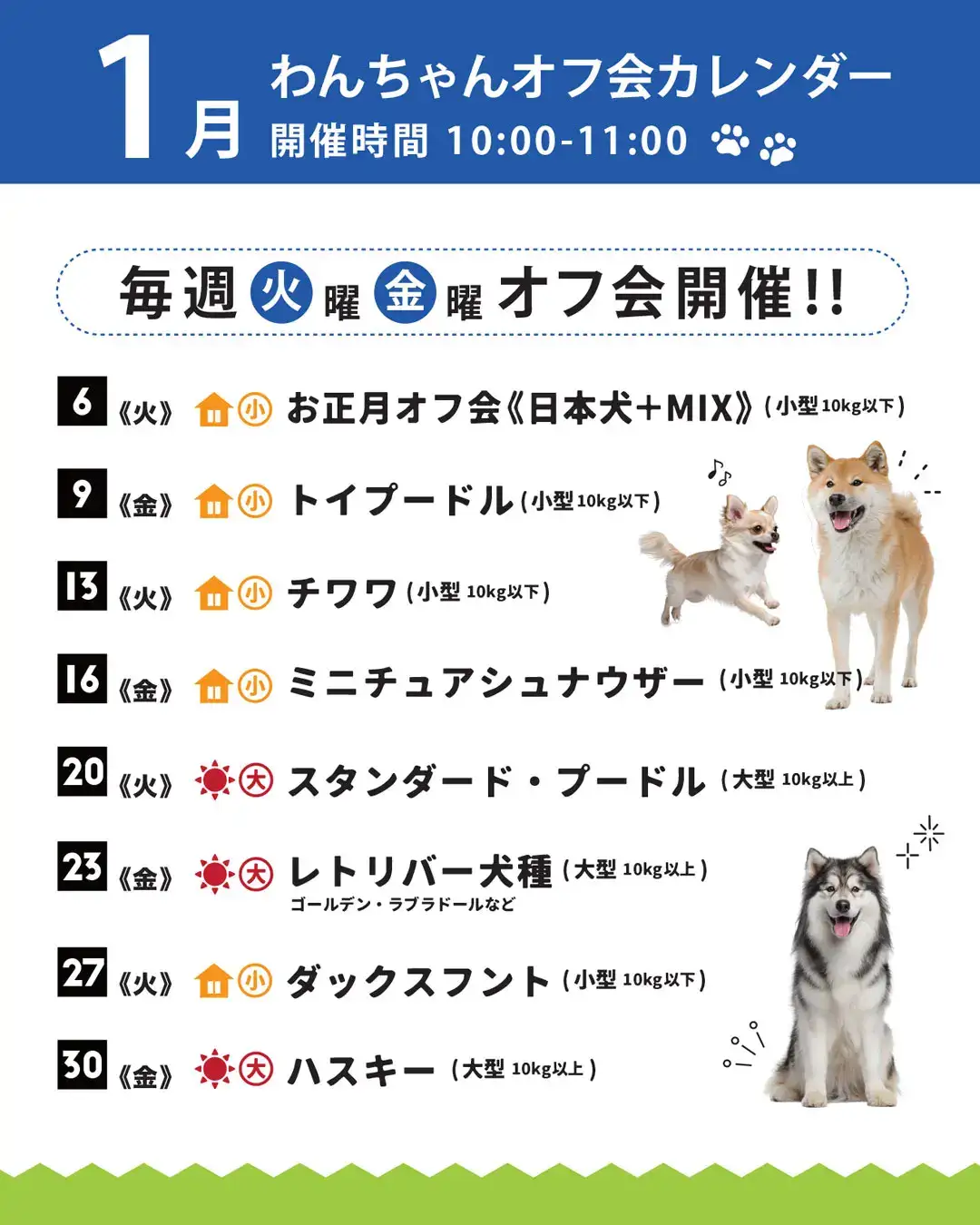 犬種や体格による相性の不安を減らすため、開催日は犬種別に設定。