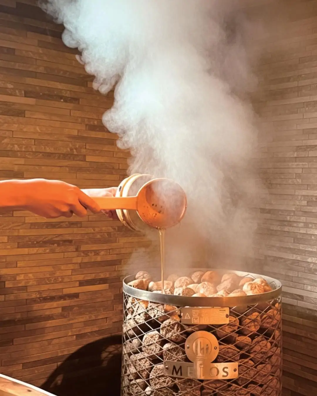 サウナストーンに水とアロマを注ぎ、立ちのぼる蒸気とともに、やさしく熱波を送ります。