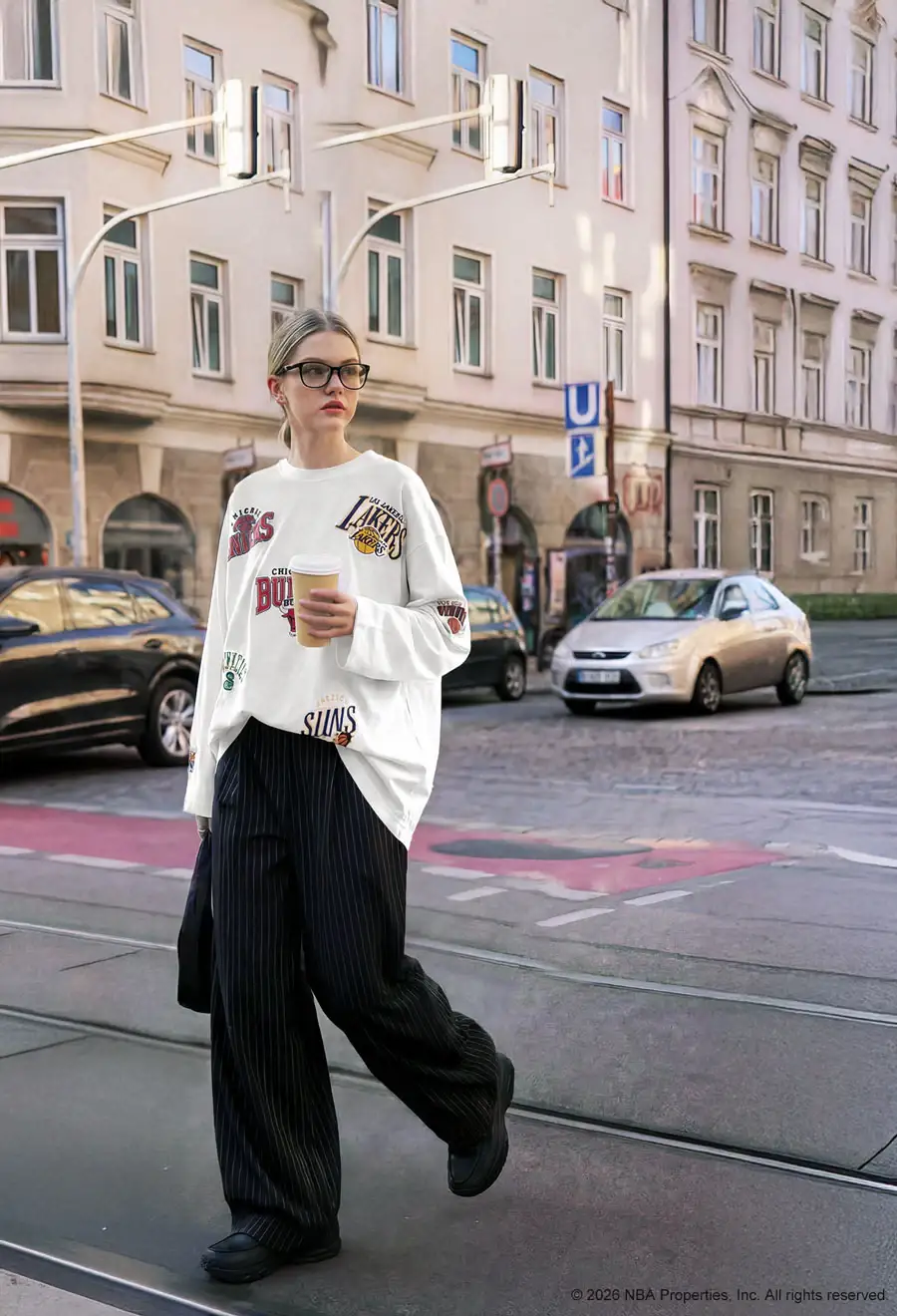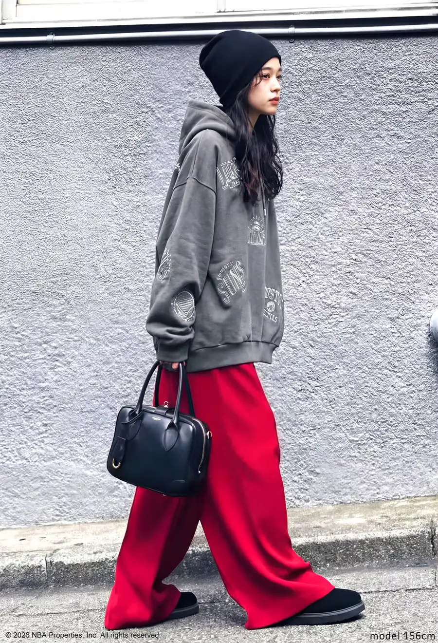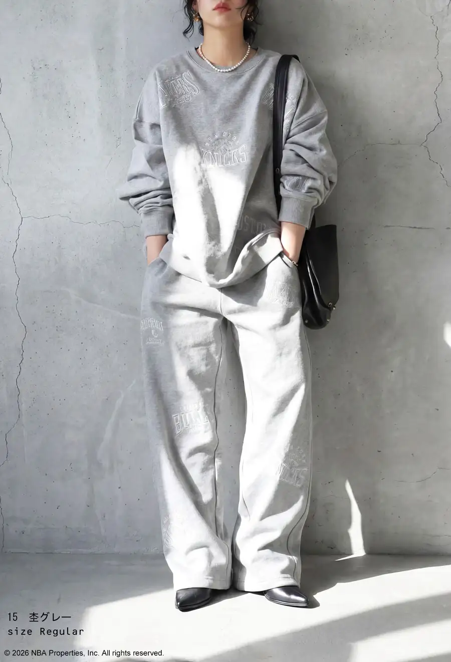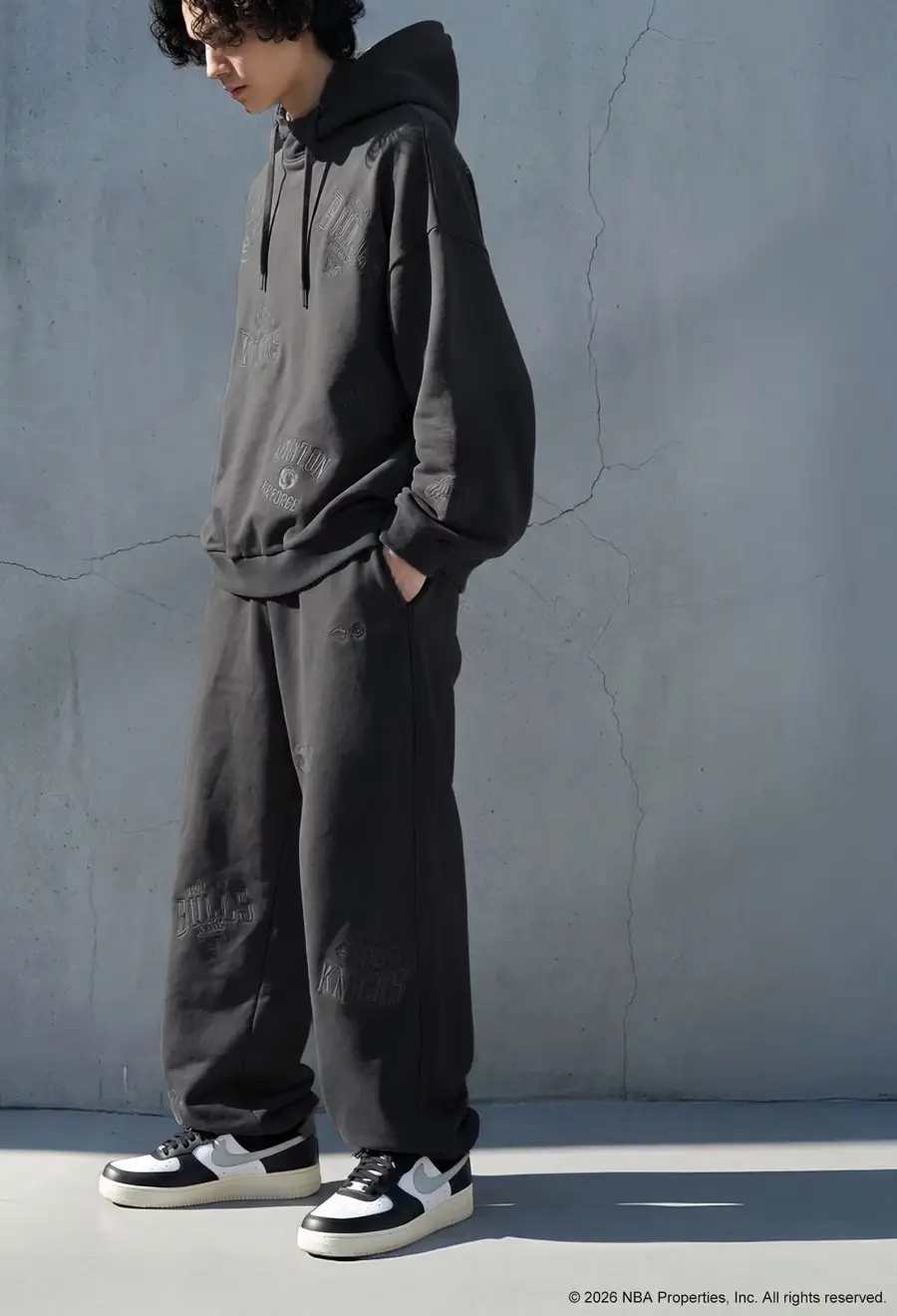 今回登場するのは、レディース・メンズを合わせた全10型のラインナップ。人気のNBAロゴ刺繍を大胆にあしらったデザインが特徴で、ユニセックス対応のトップスやボトムスを展開します。単品使いはもちろん、セットアップとしても楽しめるシリーズです。