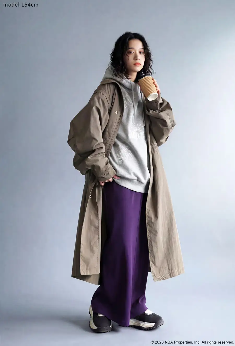 スタンド風のフードが顔まわりをすっきり見せ、ゆったりシルエットで体型カバーも◎。