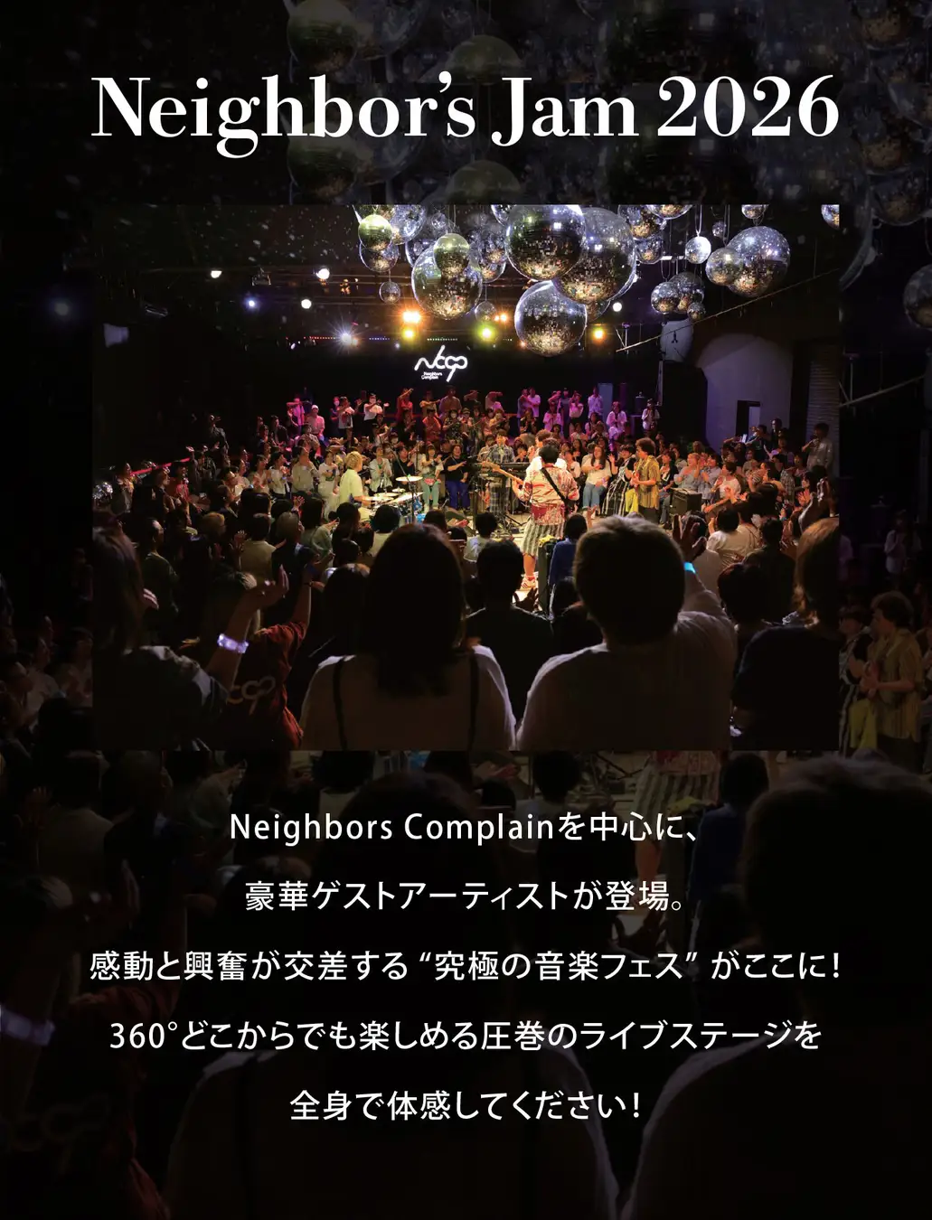 本イベントは、Neighbors Complainが中心となった、一日限りのスペシャルライブ。360°ステージを囲むプレミアム空間で、アーティストと観客の距離が限りなく近づく“体感型ライブ”が展開されます。