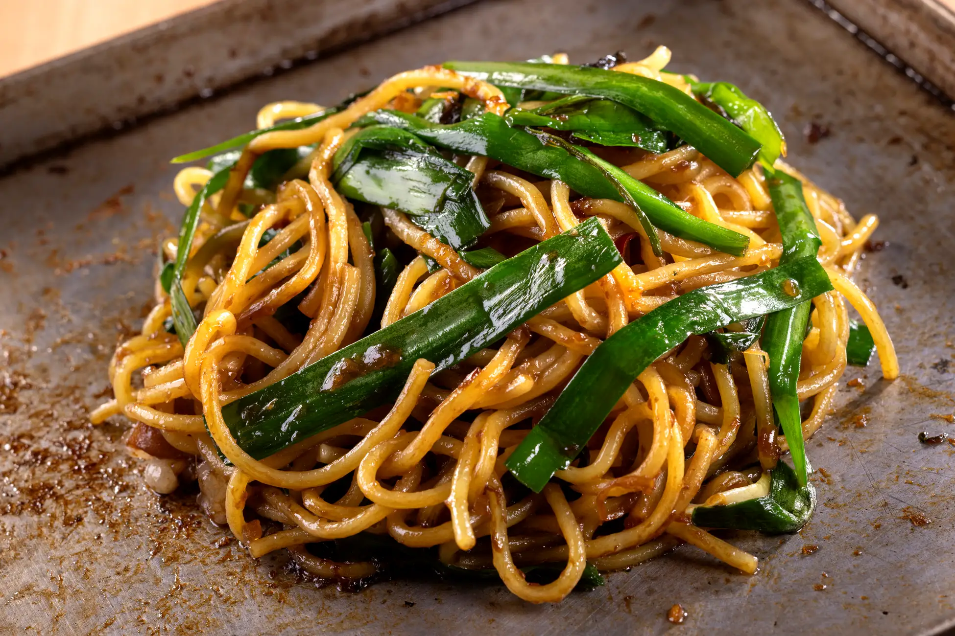 鉄板焼きで残った生姜焼きのタレに鹿沼のニラと焼きそばをしっかり絡めれば、旨味たっぷり焼きそばの完成です。