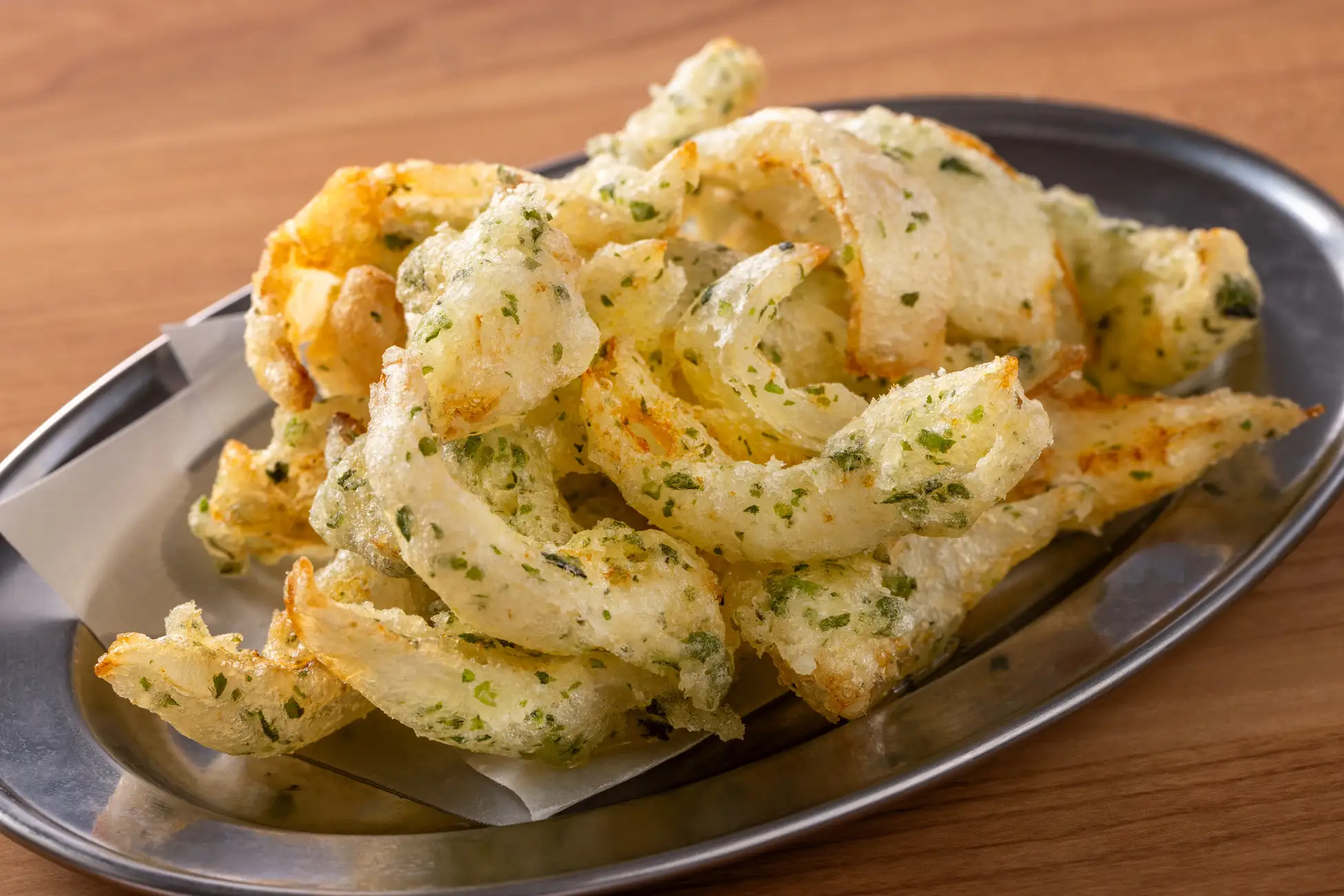 瑞々しく優しい甘さの新玉を磯部揚げ風の味わいでさっくりと軽いフリットに仕上げました。