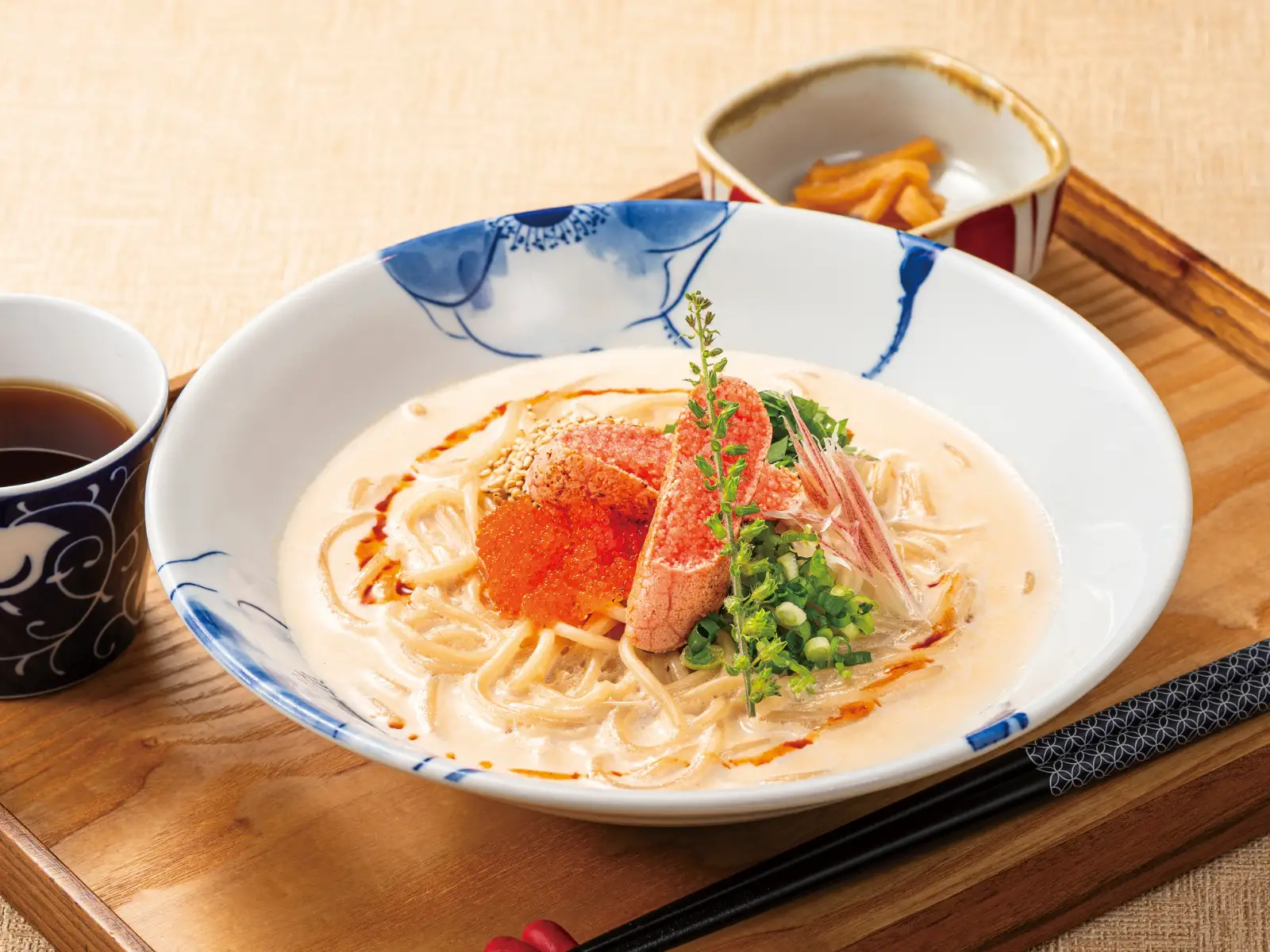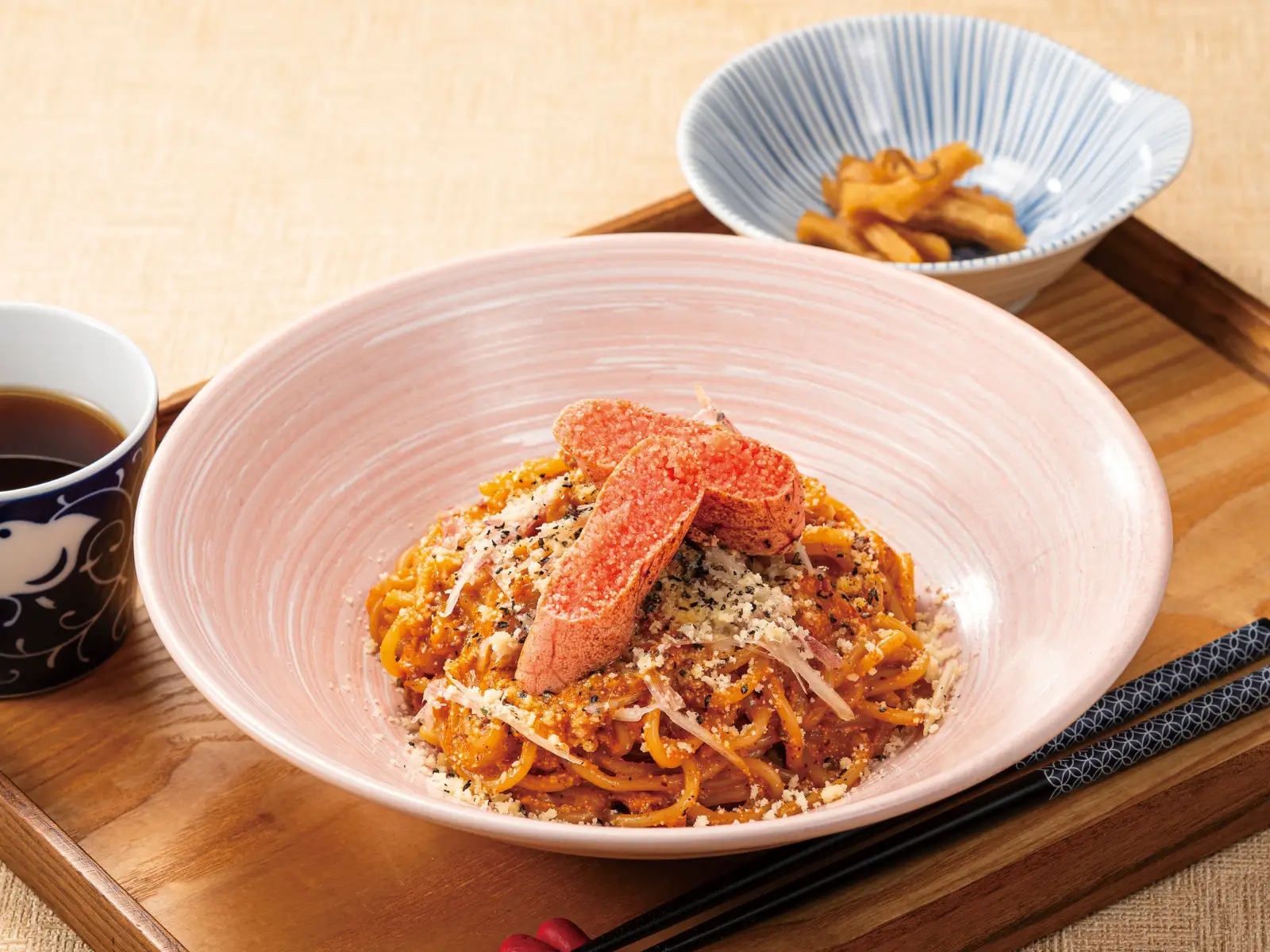 仕上げに香ばしく炙った明太子をのせることで、ひと口ごとに広がる風味とピリッとしたアクセントをプラス。たらこの魅力を豆乳クリーム仕立てで楽しむ新たな一皿です。
