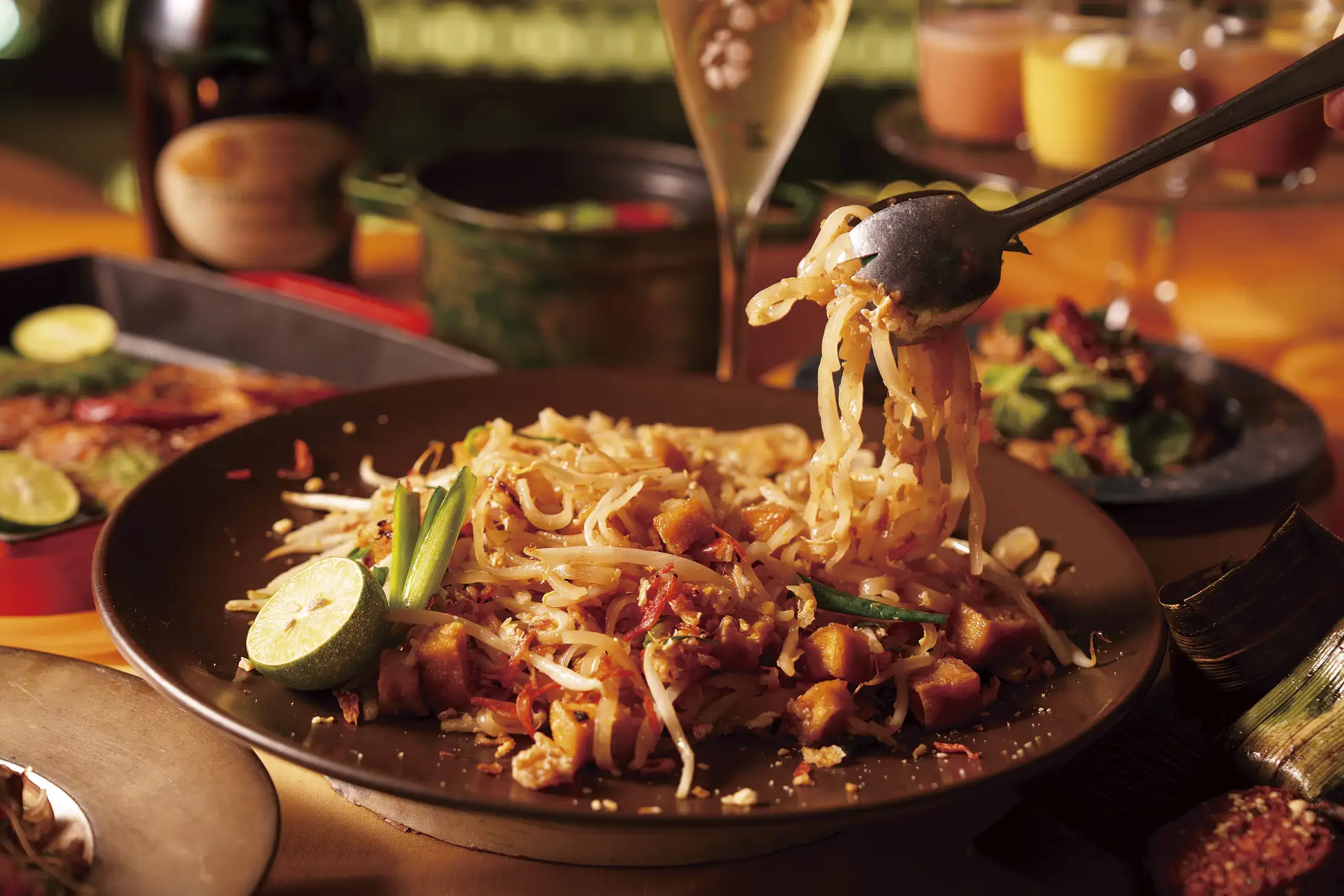 タイの焼きそば(パッ タイ)は、ご注文を受けてから調理し、出来立てをお席までお持ちします。また、宮崎牛のグリル(ヌア ヤーン)は、カウンターにてシェフがお客さまの目の前でカットしご提供します。