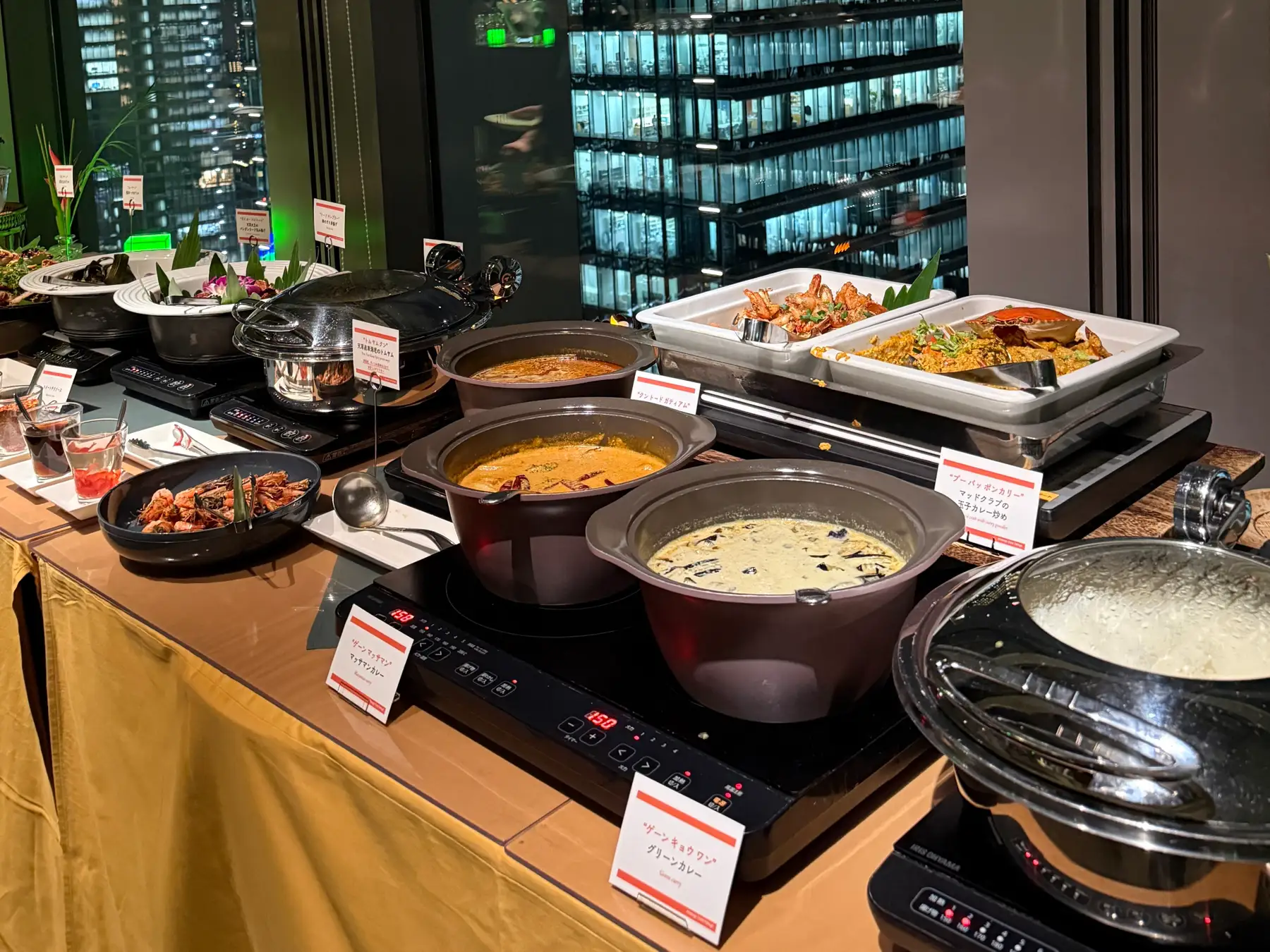 普段はランチタイムで提供している人気のブッフェを、「THAI “ORANGE NIGHT”」では特別なディナー仕様でご用意。マンゴツリー東京のシェフ・白澤による本場の味わいをブッフェスタイルでお楽しみいただけます。会場には、冷菜、温菜、揚げ物、焼き物、カレー、麺料理、デザートまで、タイ料理の魅力を存分に味わえるメニューが並びます。