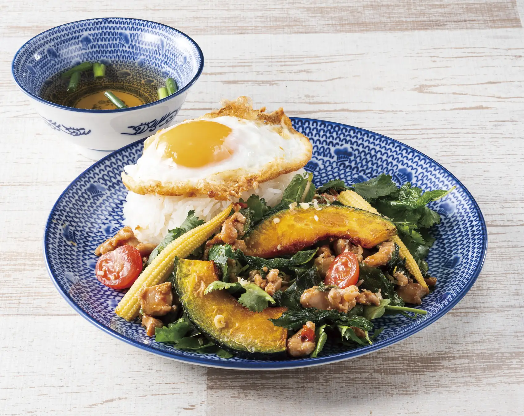 スパイシーなガパオに、かぼちゃ・ヤングコーン・ミニトマトを盛り合わせ、数種類のハーブで仕上げました。目玉焼きとジャスミンライス、具材を一緒に混ぜ合わせることで、タイの香りを楽しめる一品です。