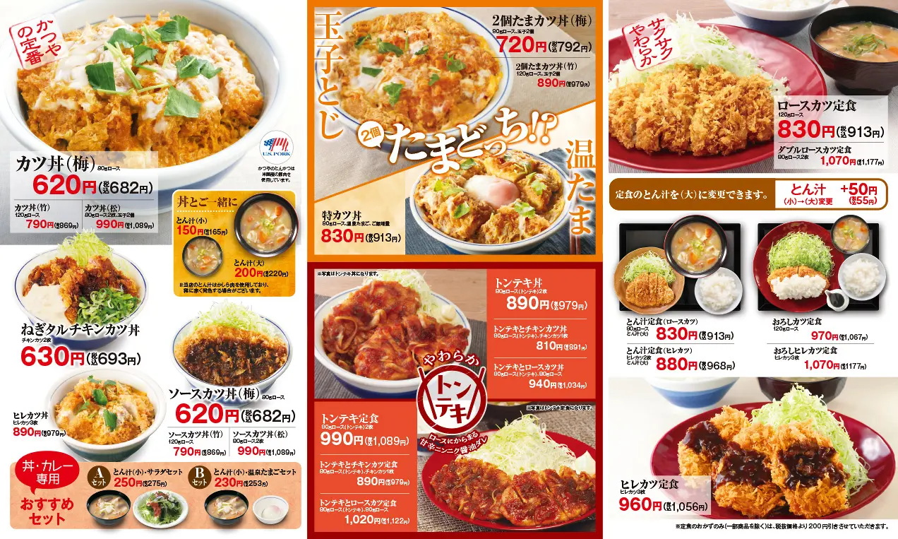 定番メニューの「カツ丼(梅)80gロース」は620円(税込682円)。定⾷メニューで⼈気の、サクサクな⾐とやわらかなお⾁を味わえる「ロースカツ定⾷ 120gロース」は830円(税込913円)と、お⼿頃価格で「とんかつ」を楽しめます。