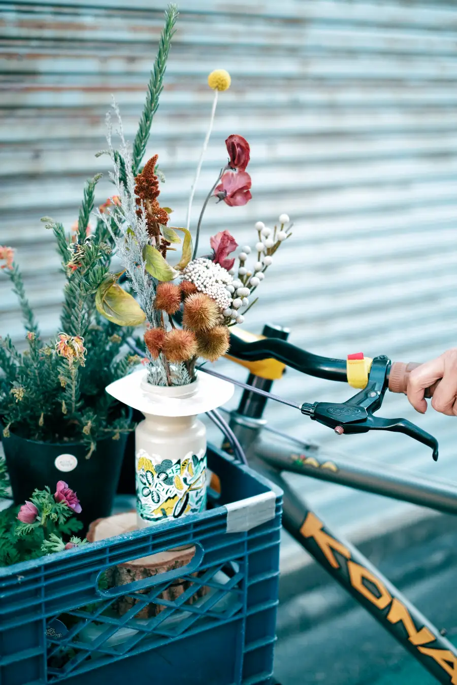 自転車用ボトルに花を装飾し、インテリアとして楽しめる作品を制作するワークショップ。“サドルから降りてるとき=部屋でゆっくり過ごす時間”、“ボトルだって休日を過ごしたいよね”という、少し肩の力が抜けるようなコンセプトのもと、生花を用いて制作し、時間とともにドライフラワーへと変化していく過程も楽しめます。