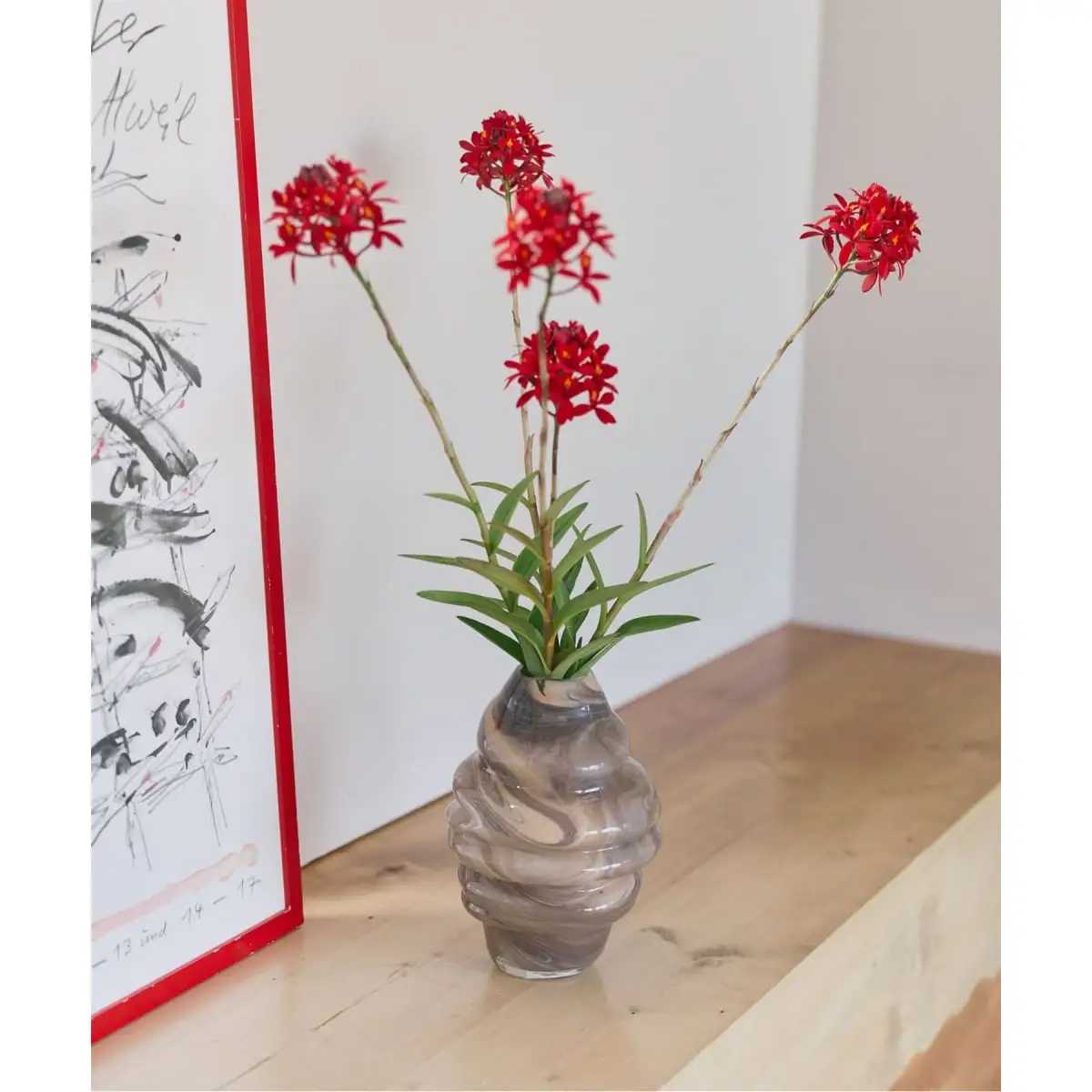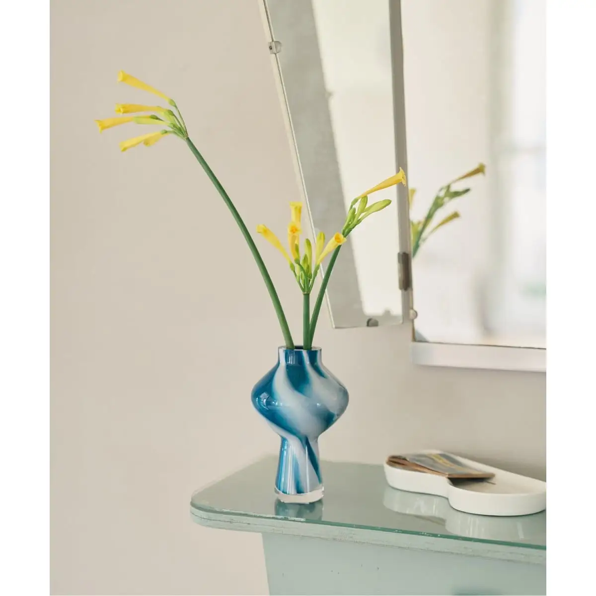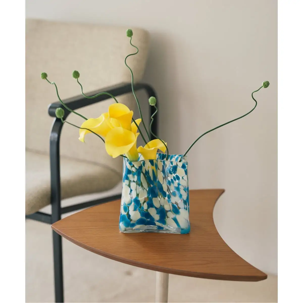 職人が吹き上げる手作業による一点ずつ仕上げが特徴で、フォルムのわずかなゆらぎや、光を屈折させる気泡、色ガラスの濃淡が個性となるように仕上げられており、花束をふんわり活けられるボリュームタイプから、デスクにも置きやすい一輪挿しまで幅広く揃えたラインナップを展開。