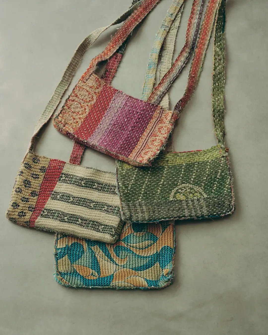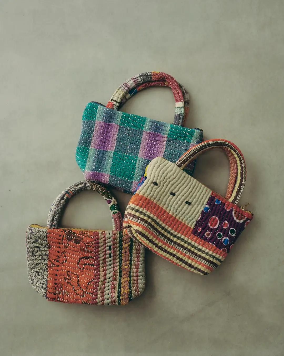 インドやバングラデシュに伝わる刺し子布「カンタ」は、古布を重ね、一針一針縫い合わせた一点物のテキスタイル。すべて異なる表情を持ち、手仕事ならではの温もりが感じられます。