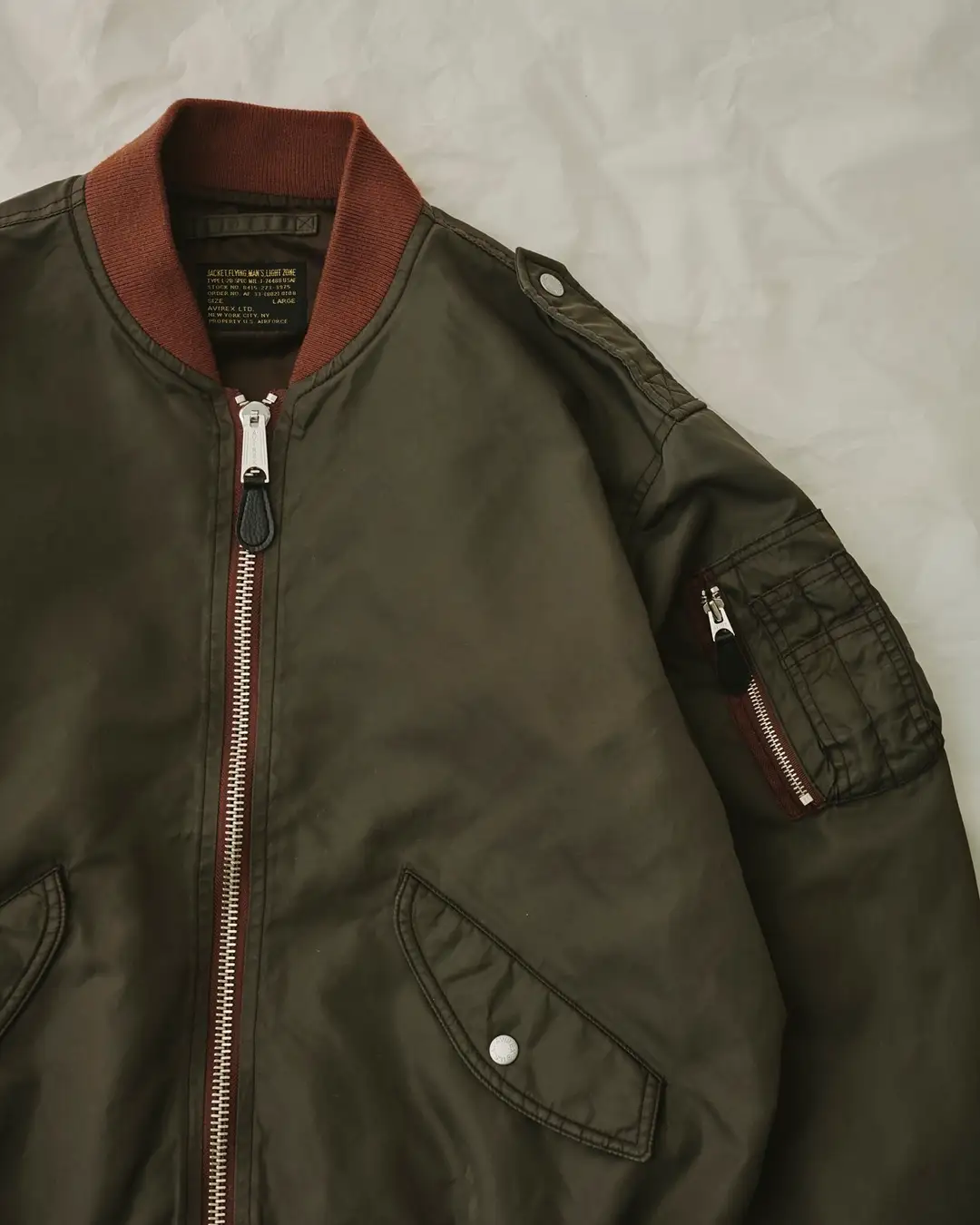 本作は、1950年代初期に採用されていたL-2Bフライトジャケットをベースに製作。中期以降のモデルとは異なる、希少な「SPEC:MIL-J-7448B」のディテールを再現しています。最大の特徴は、当時の仕様に倣い、裏地にオレンジカラーを使用していない点。ヴィンテージ市場でも流通の少ない初期型ならではの表情を、現代に蘇らせました。クラシックな佇まいを残しながら、サイズ感はオリジナルパターンでアップデート。現代のスタイルに馴染むバランスへと再構築し、快適な着心地と洗練されたシルエットを実現しています。素材には、AVIREXオリジナルのヘヴィツイルナイロンを採用。