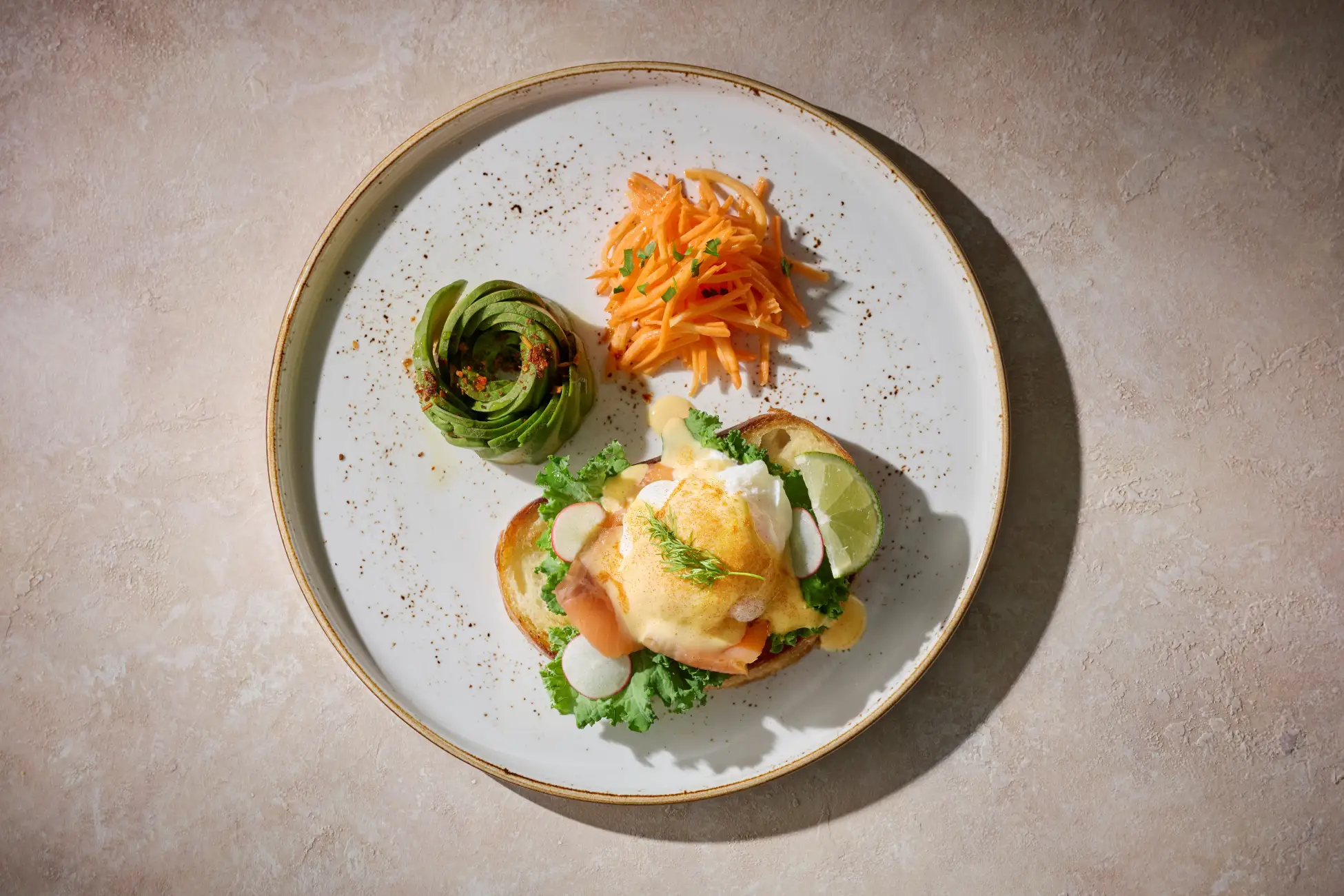「竹鶏の卵」を使用したポーチドエッグとスモークサーモンをのせたオープントースト。自家製ラペを添えて。