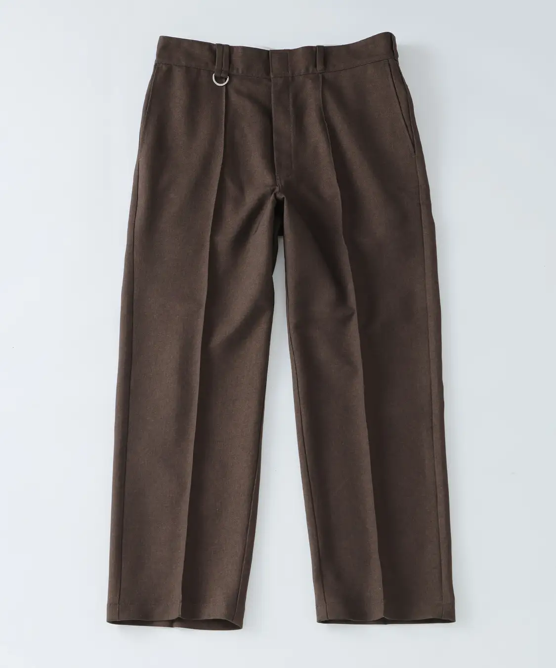 本作は、過去にrelumeで別注展開した1980年代のDickiesをベースに、現行の874とは一線を画すポリエステルサージ生地を採用したモデルを継承。現行874とは異なり、股上を深めに設定し、裾にかけてはテーパードではなく、ストンと落ちるストレートシルエットに仕上げています。この生地特有の「なめらかな落ち感」が、美しいドレープを生み出し、リラックス感がありながらも上品な佇まいを演出。足のラインを拾いすぎず、ワークパンツとスラックスの中間のような、大人に向けた一本として提案します。素材の良さを活かすため、フロントにはピンタックを採用。ワークパンツの持つタフなイメージに、relumeらしい上品さとセンタープレスを加えることで、カジュアルからきれいめまで幅広いスタイリングに対応する万能なスラックスへと昇華しました。また、大人のファッションにさりげない遊び心を添えるディテールとして、DickiesオリジナルのDカンを付属。ウォレットチェーンやキーリングを通すこともでき、無骨さと洗練が共存するアクセントとなっています。Dカンを配置したベルトループは2本仕様とし、トップスをタックインした際には腰まわりのデザインポイントとしても機能。ワークウェアとしての信頼性と、ポリエステルサージ生地ならではの現代的で洗練された落ち感を両立しています。カラーは、ブラック、ブラウン、グレーグリーンの3色展開。ヴィンテージライクでありながら、今の時代にフィットする一本に仕上がりました。