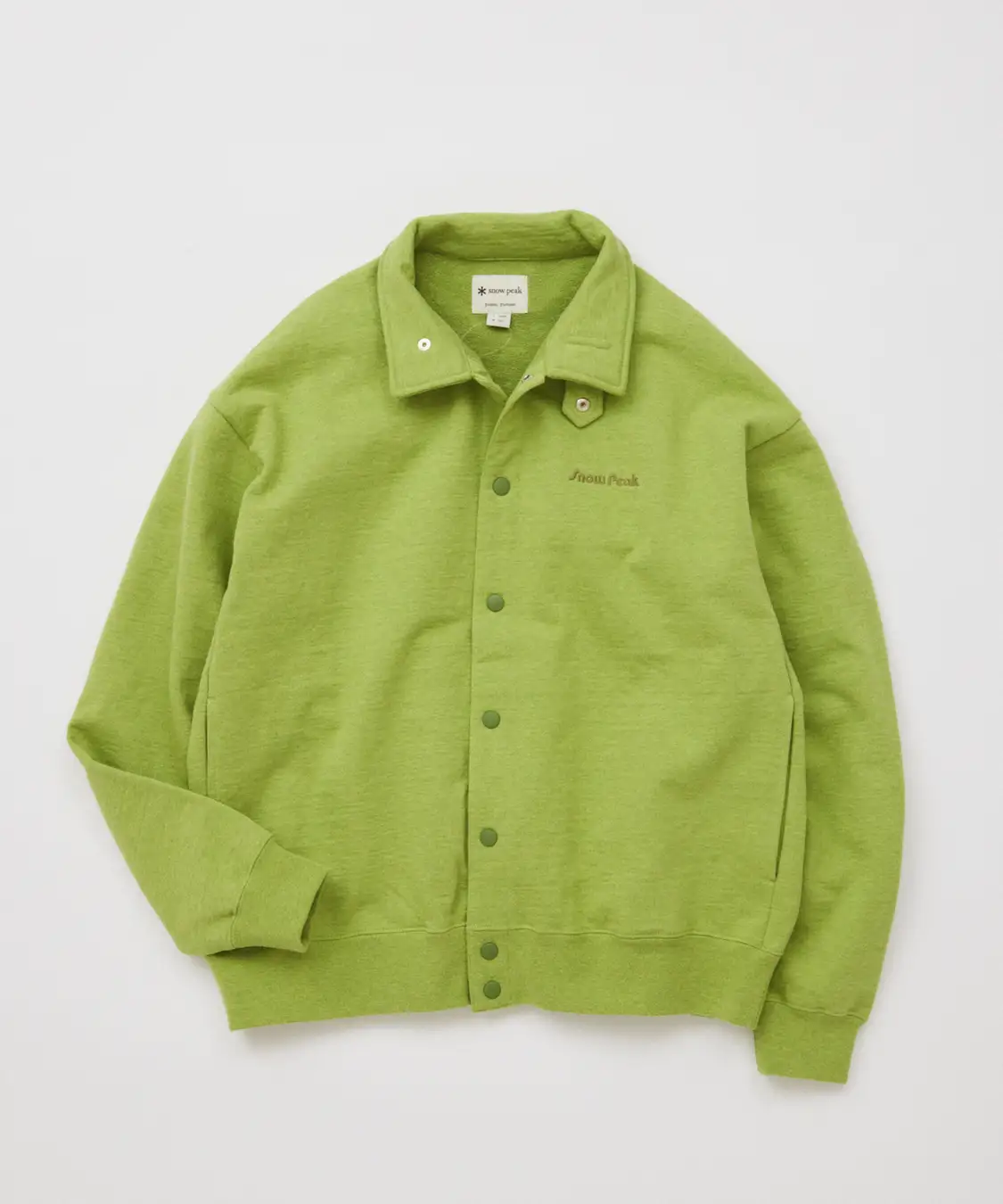 スウェットは定番の度詰め杢素材をベースに、糸染めによるカラー杢で別注。鮮やかなピンクとグリーンをカラー杢でマイルドに表現し、アウトドアブランドらしい色味と2000年代を想起させる空気感を備える。フルスナップ仕様と立て寝かせ両用の襟が、リブ襟など特有のスポーティさを抑え、幅広いスタイリングに対応できるようアップデート。