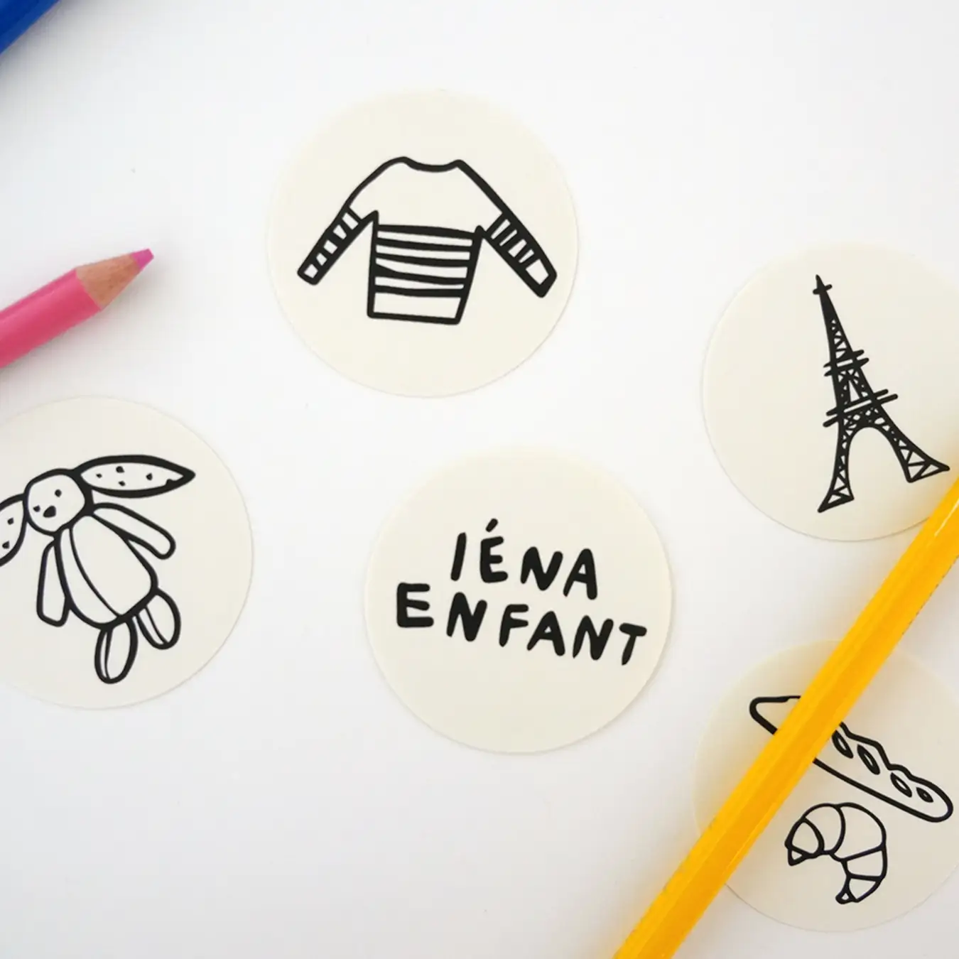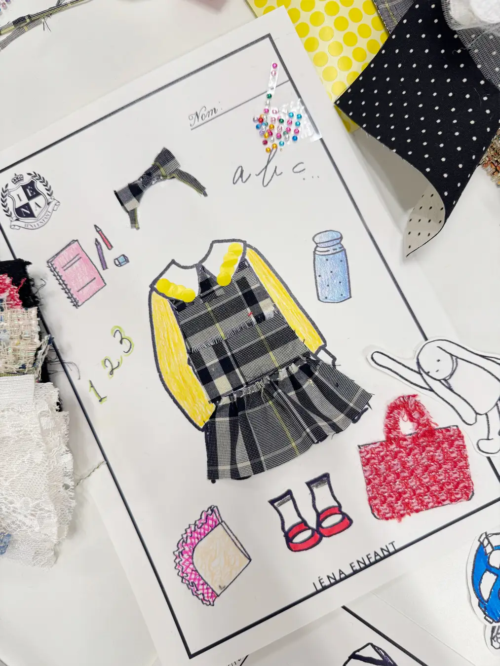 IÉNA ENFANTデザイナーが描くオリジナルデザイン画6枚をはじめ、実際のお洋服作りから⽣まれた残布、遊び⼼あふれるシールをセットにしたオリジナルキッド。
