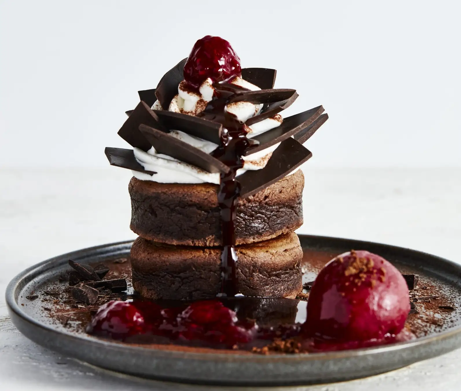 香り高いココア生地に、ヴァローナ社のリッチなチョコクリーム、ラズベリーソース、キルシュクリームを合わせた冬季限定の贅沢な一皿は、まさにチョコだくで背徳感たっぷり!