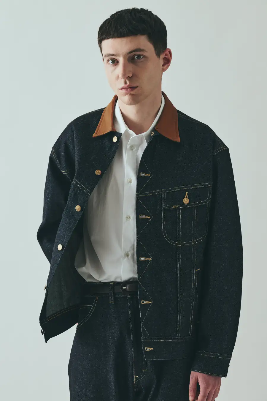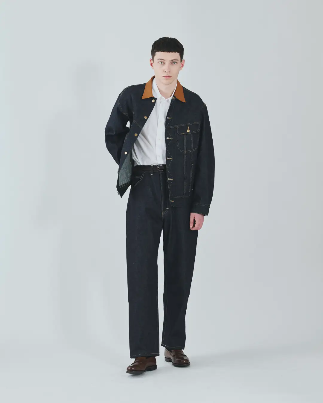 デニムにはあえてリジット素材を採用し、襟元にはレザーを配することで、ワーク由来の武骨さと都会的なムードが共存する仕上がりに。