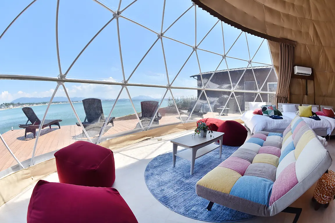 玄界灘を一望できるオーシャンフロントの立地が魅力。超大型ドームテントやサウナ付き客室、ペット同伴可能な客室など、バリエーション豊かな滞在が楽しめます。ジェラート食べ放題やピザ作り体験など、体験型コンテンツも充実しています。