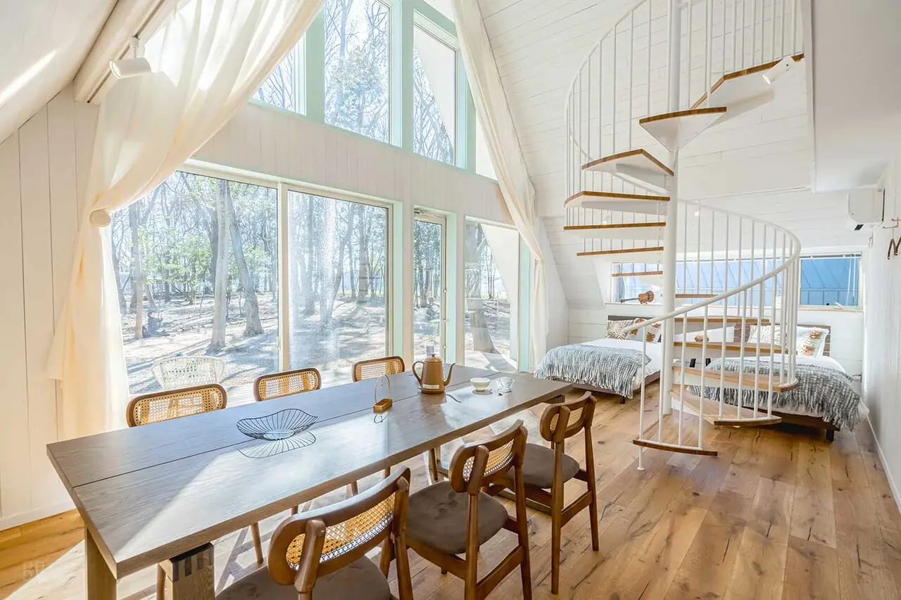 木々に囲まれたグランピングコテージは三角屋根の開放的な室内スペースにハワイアンテイストのインテリアを施し、まるで海外にいるかのような非日常空間。