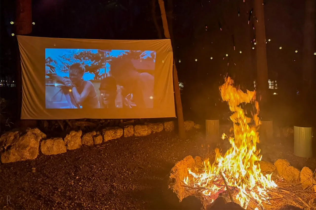 施設内の焚火スペースでは、屋外シアター鑑賞と焼きマシュマロを楽しめるサービスを新たに開始しました。揺らめく炎を囲みながら映像を楽しみ、焼きたてのマシュマロを味わうひとときは、夜のグランピングステイをより印象深い特別な時間へと演出します。