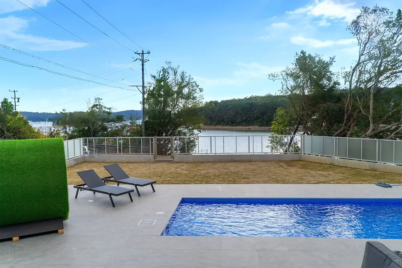 敷地内にはプライベートプールを完備。海を眺めながら、開放的なひとときをお楽しみいただけます。さらに、プライベートサウナの後にそのままプールでクールダウンできる贅沢も。上質な設備を備えたプライベートヴィラならではの時間をお過ごしください。