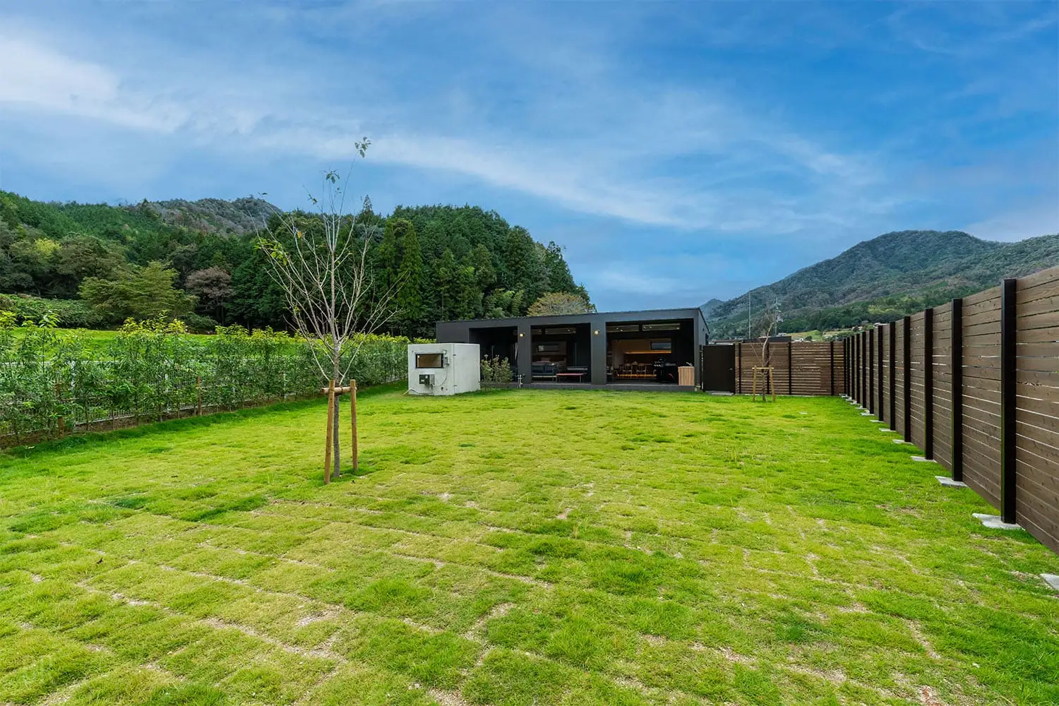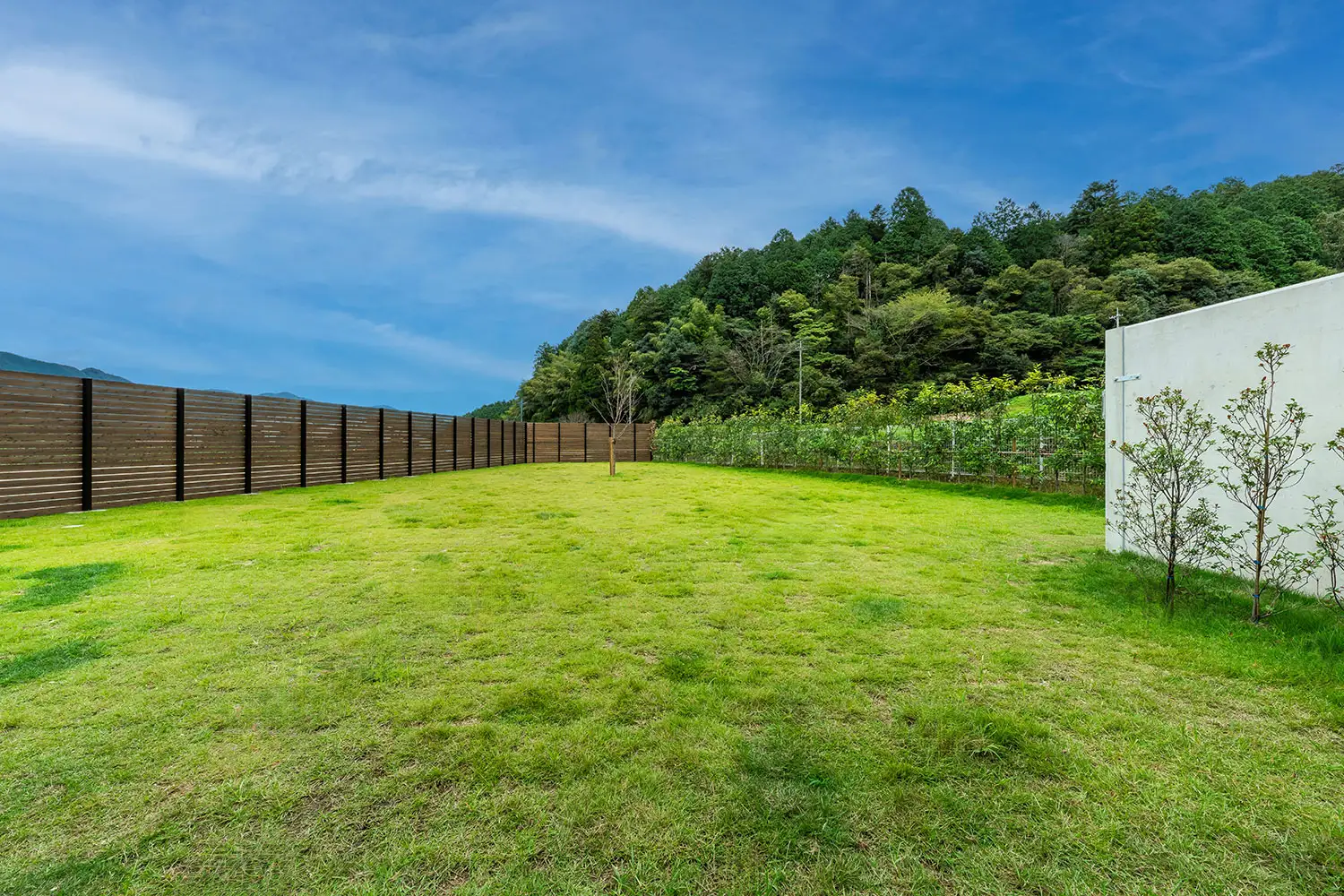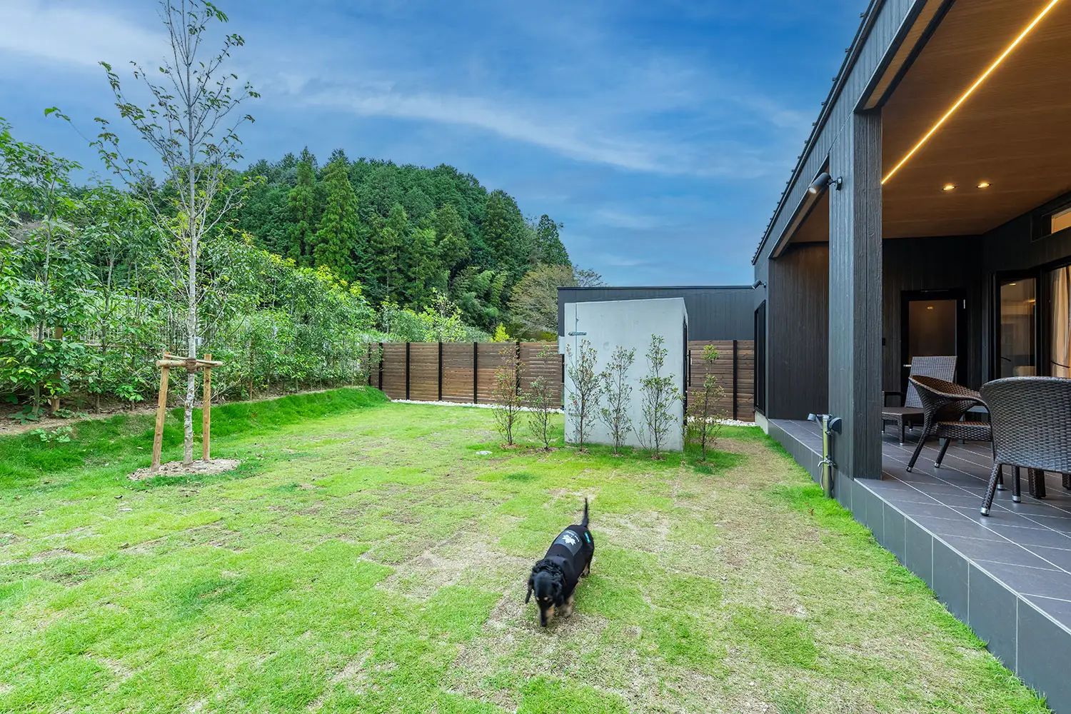 全棟に専用のプライベートドッグランを完備。なかでもスイートヴィラに備えられたドッグランは400㎡を超える広さを誇り、中四国エリア最大級のスケールです。完全プライベート仕様のため、他のわんちゃんや周囲を気にすることなく、ノーリードでのびのびと安心して過ごせる環境が整っています。