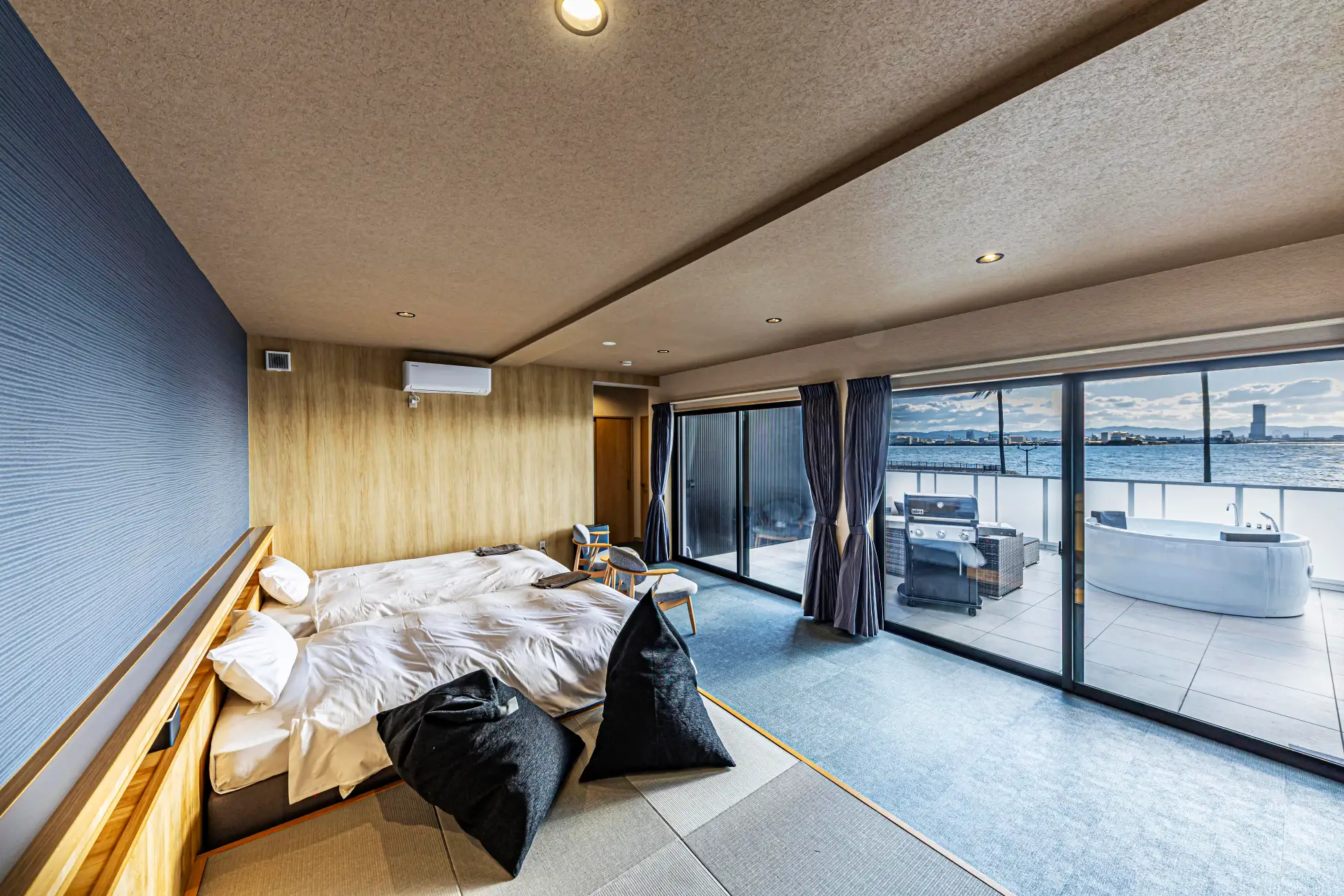 全8室すべてがオーシャンビューという贅沢なロケーション。目の前に広がる海と空。夕暮れ時には「日本の夕陽百選」に選ばれた美しいサンセットを、お部屋からゆったりと眺めることができます。花火の夜も、海辺ならではの開放的な景色と共に特別な時間を演出します。